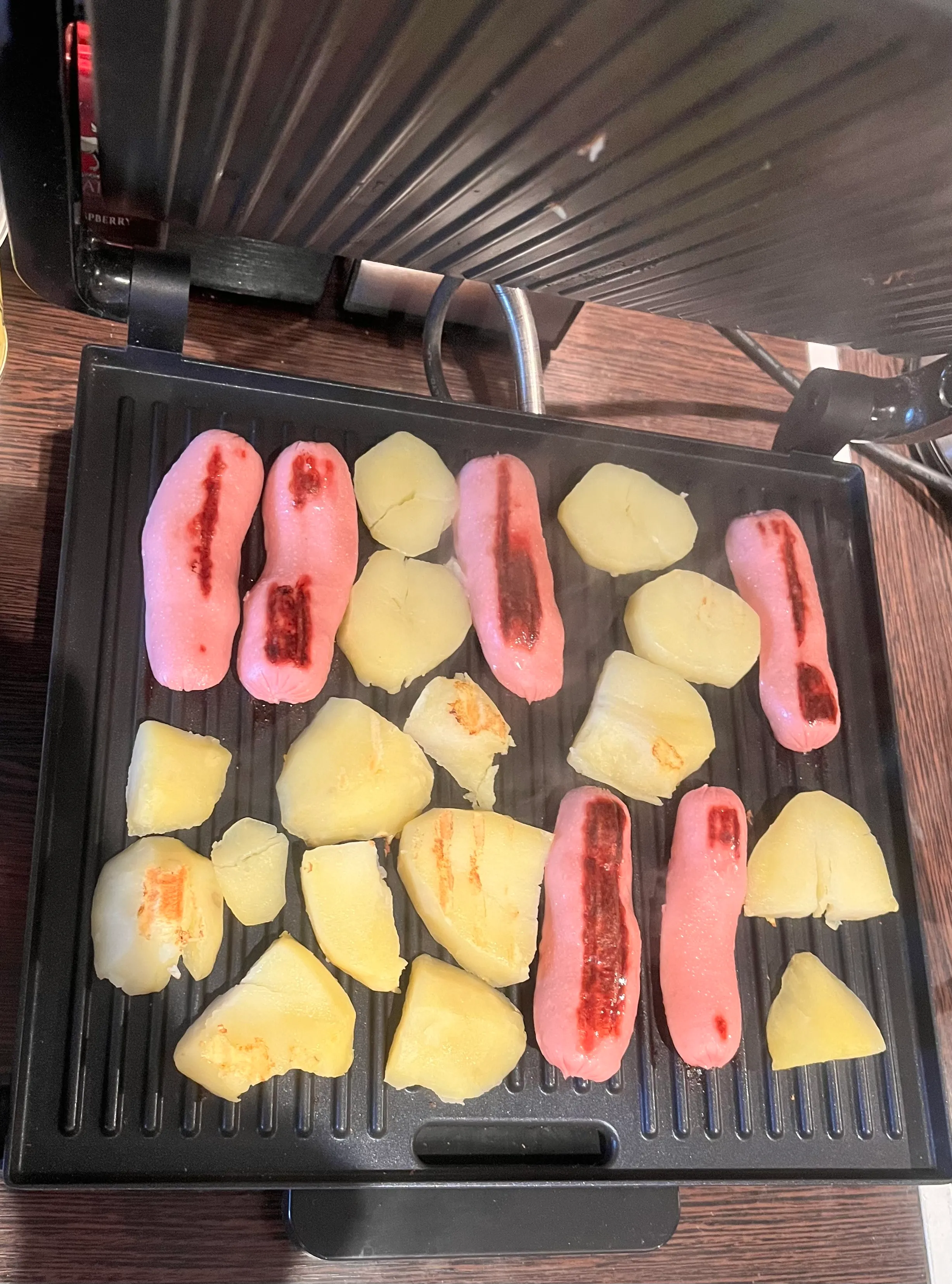 Отварите картофель, порежьте кружками. Сосиски (можно заменить сардельками или колбасками), уложите всё на гриль, готовьте 5 минут до образования следов прожарки.