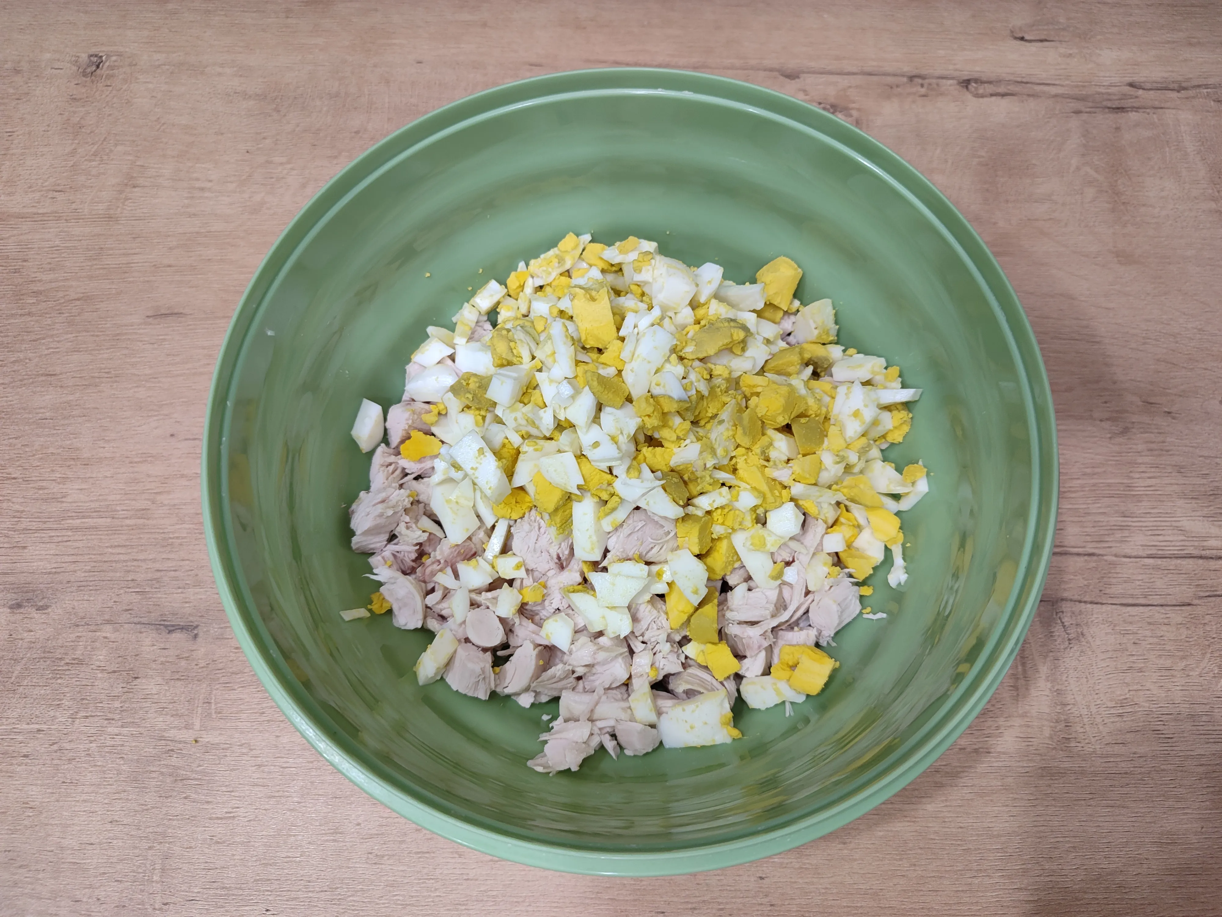 Варёное куриное яйцо мелко накрошите и отправьте к мясу. Один желток отложите для украшения верха салата.