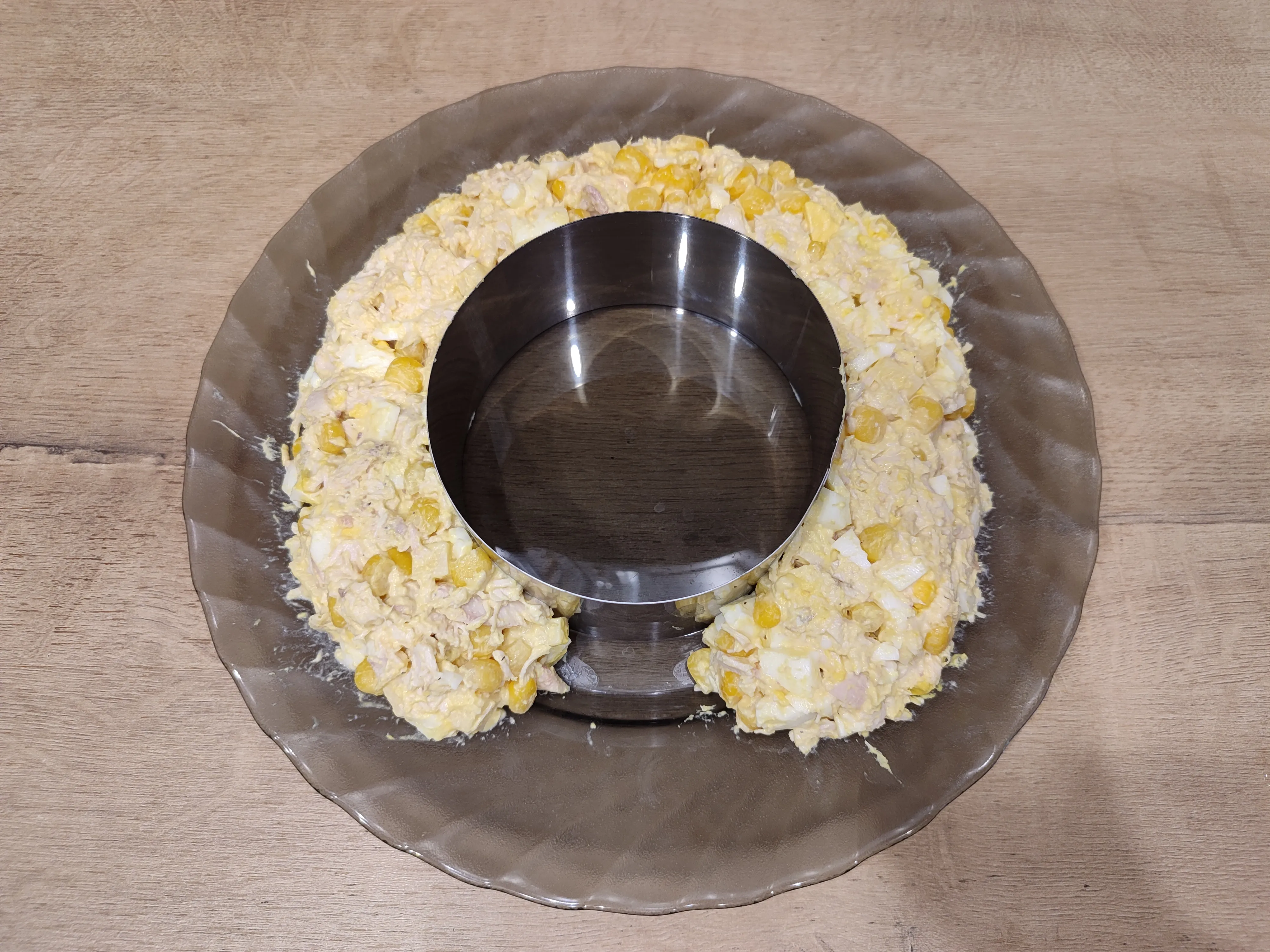 По центру тарелки расположите сервировочное кольцо. Вокруг этого кольца, не доходя до низа, выложите готовый салат. Аккуратно извлеките сервировочное кольцо.