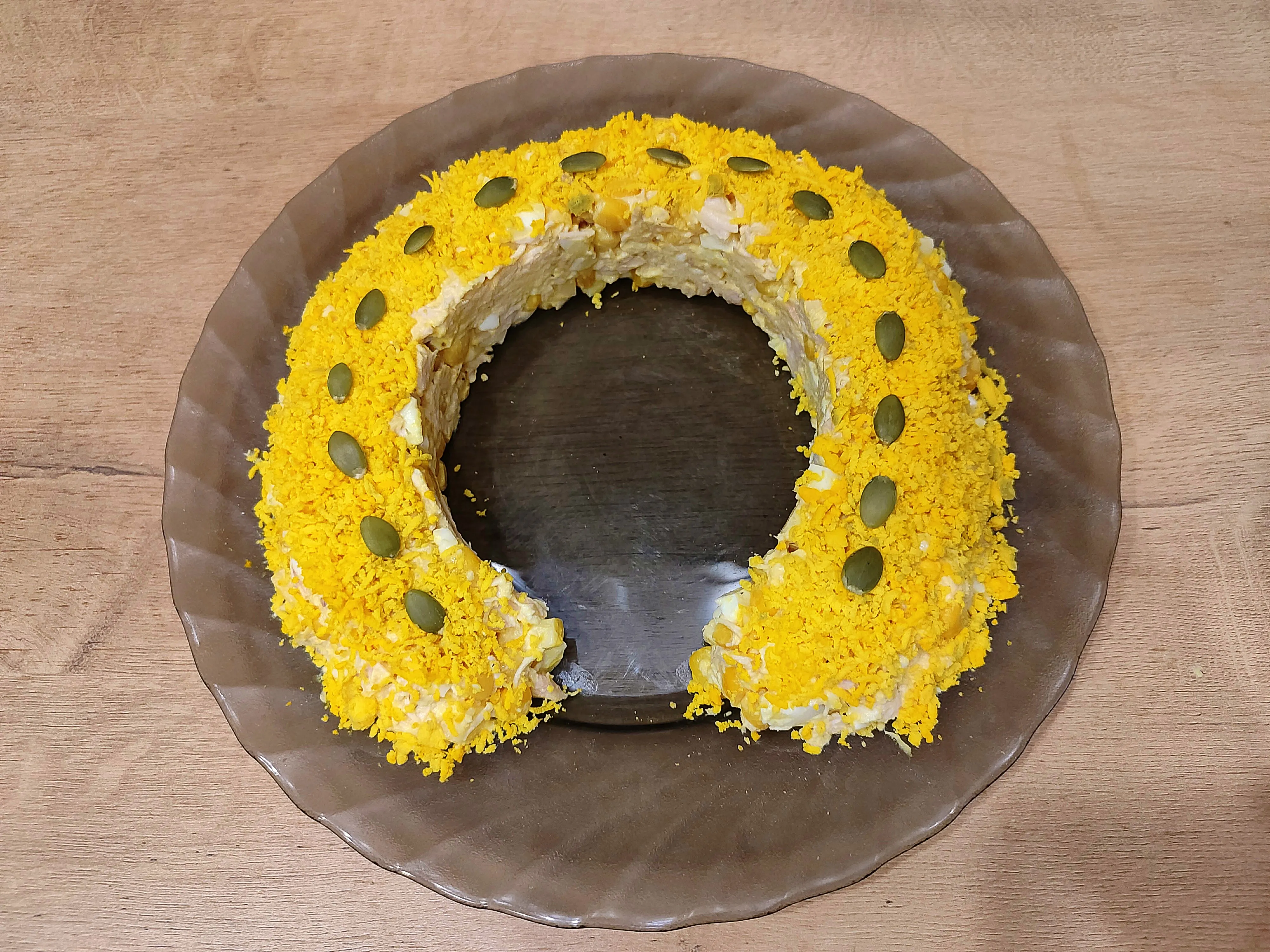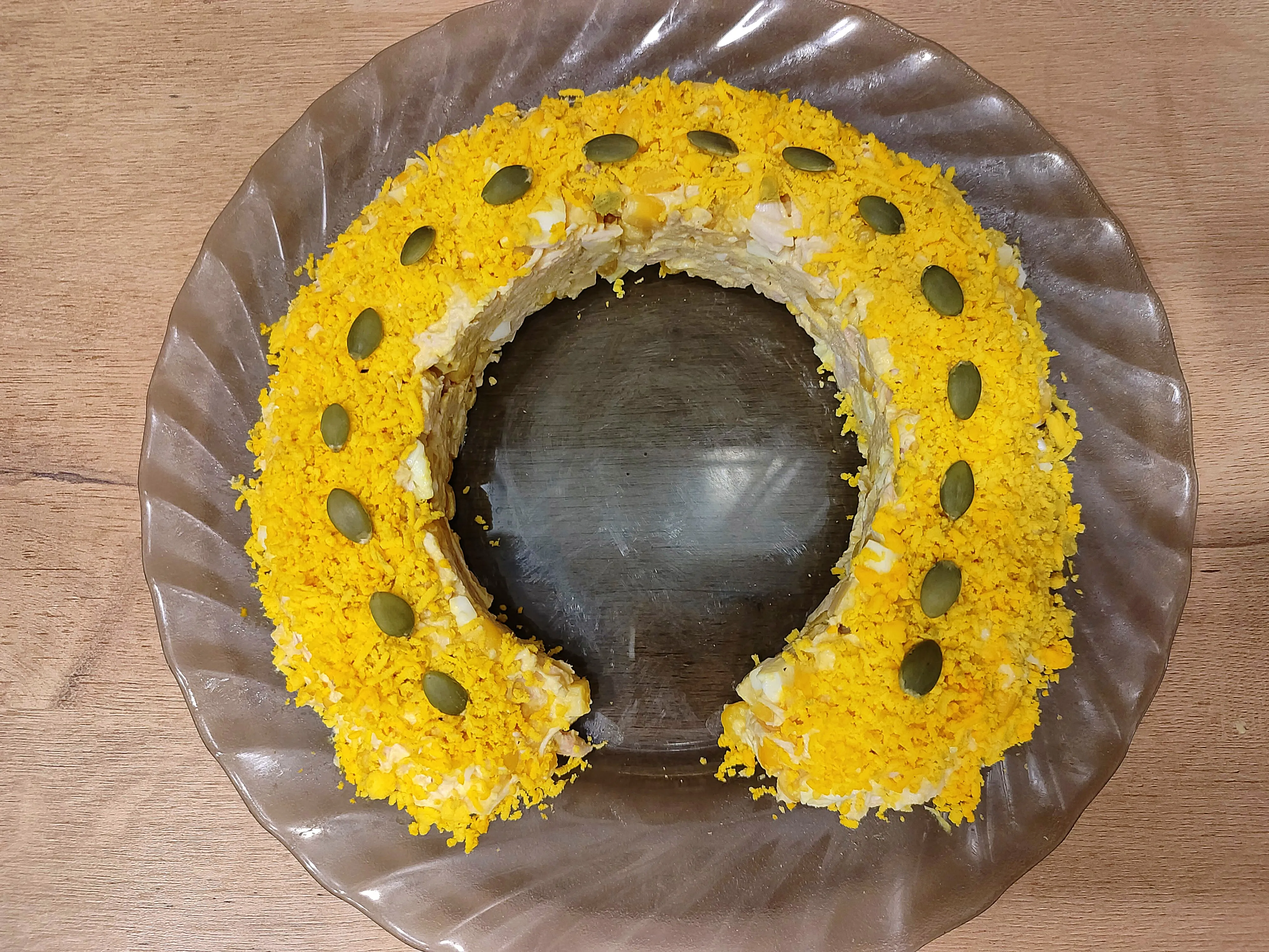Верх салата украсьте тёртым куриным желтком и семенами тыквы.