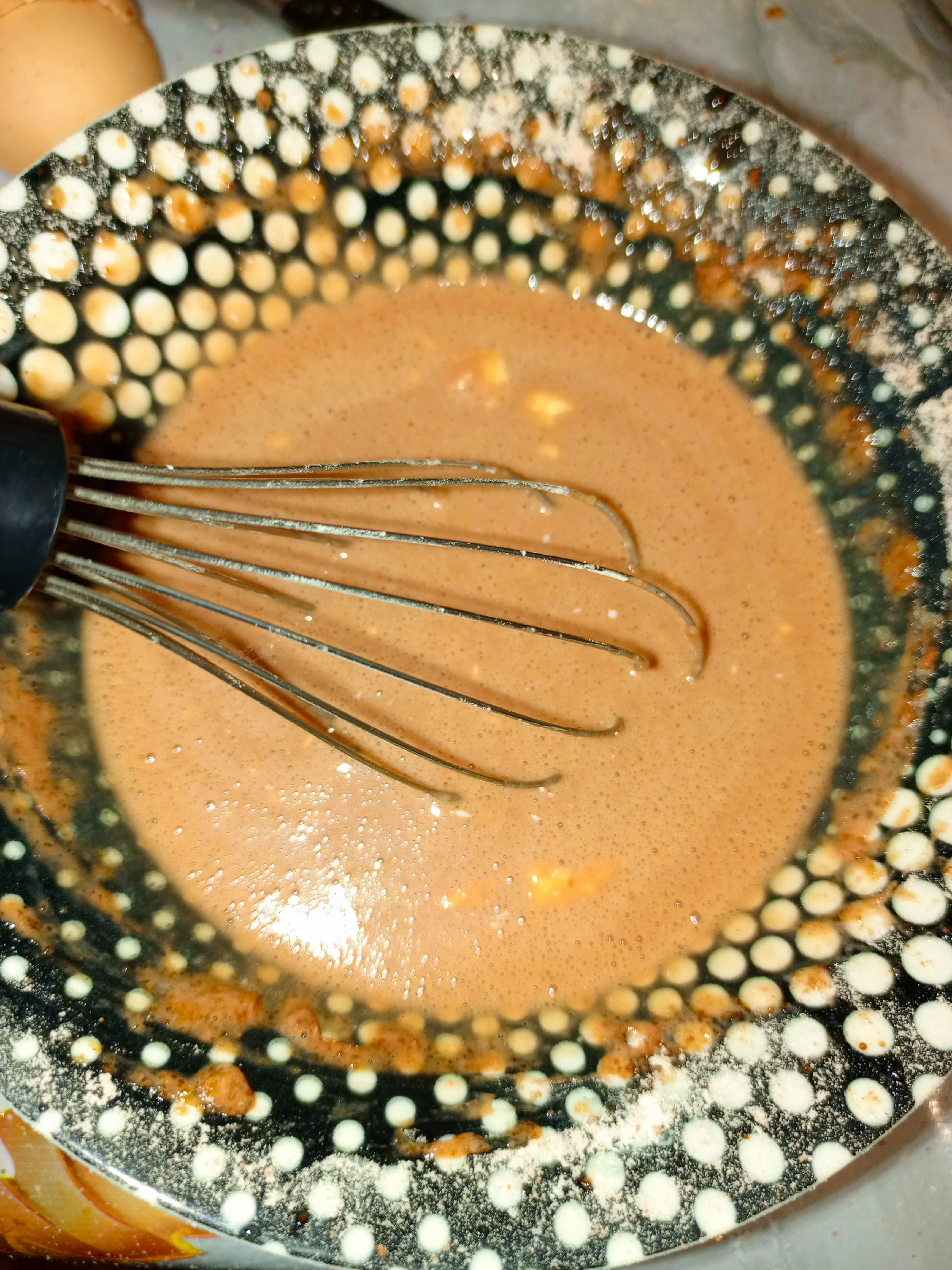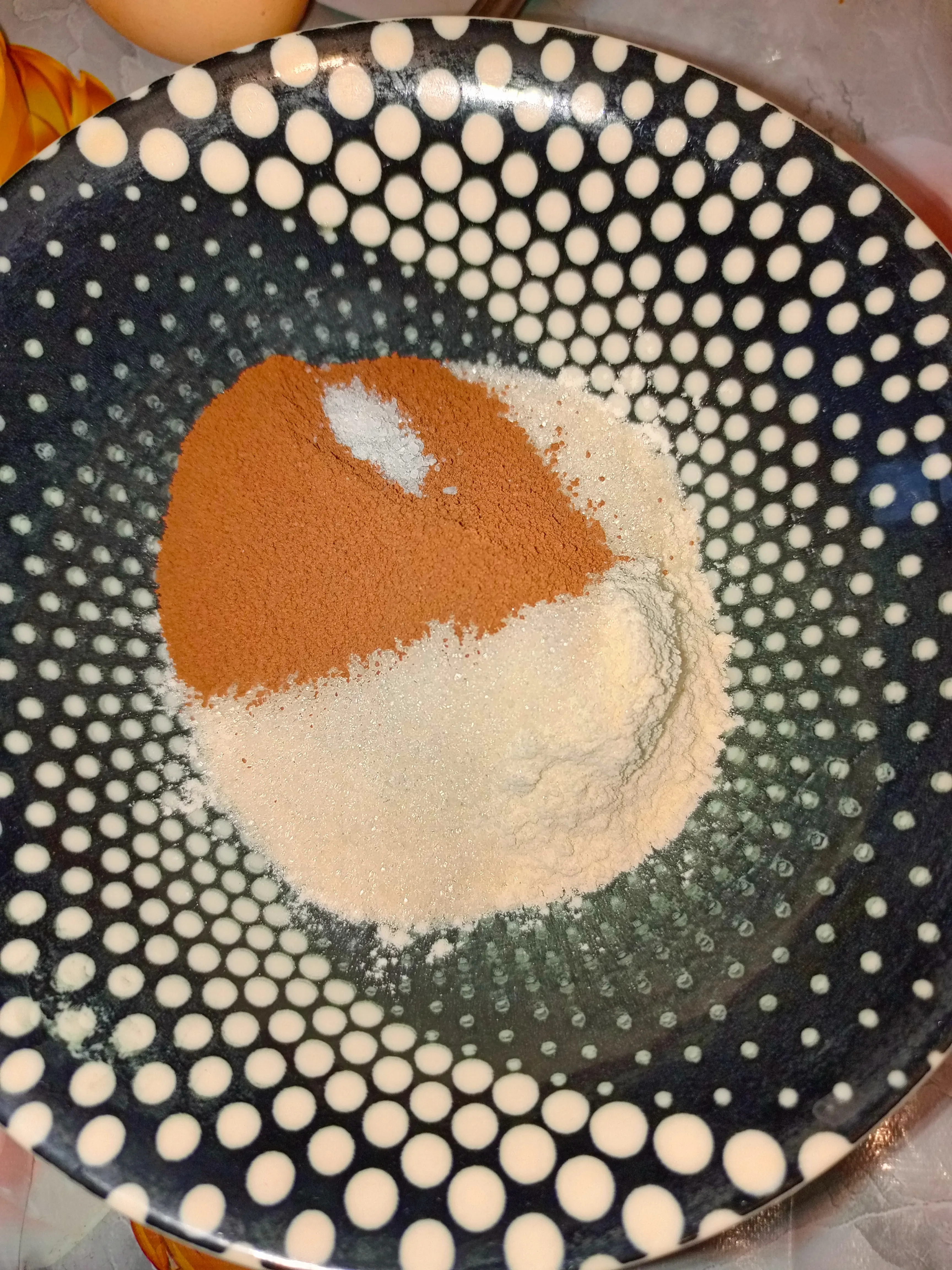 Смешайте все сыпучие ингредиенты в одну чашку: мука, сахар, соль, какао-порошок.