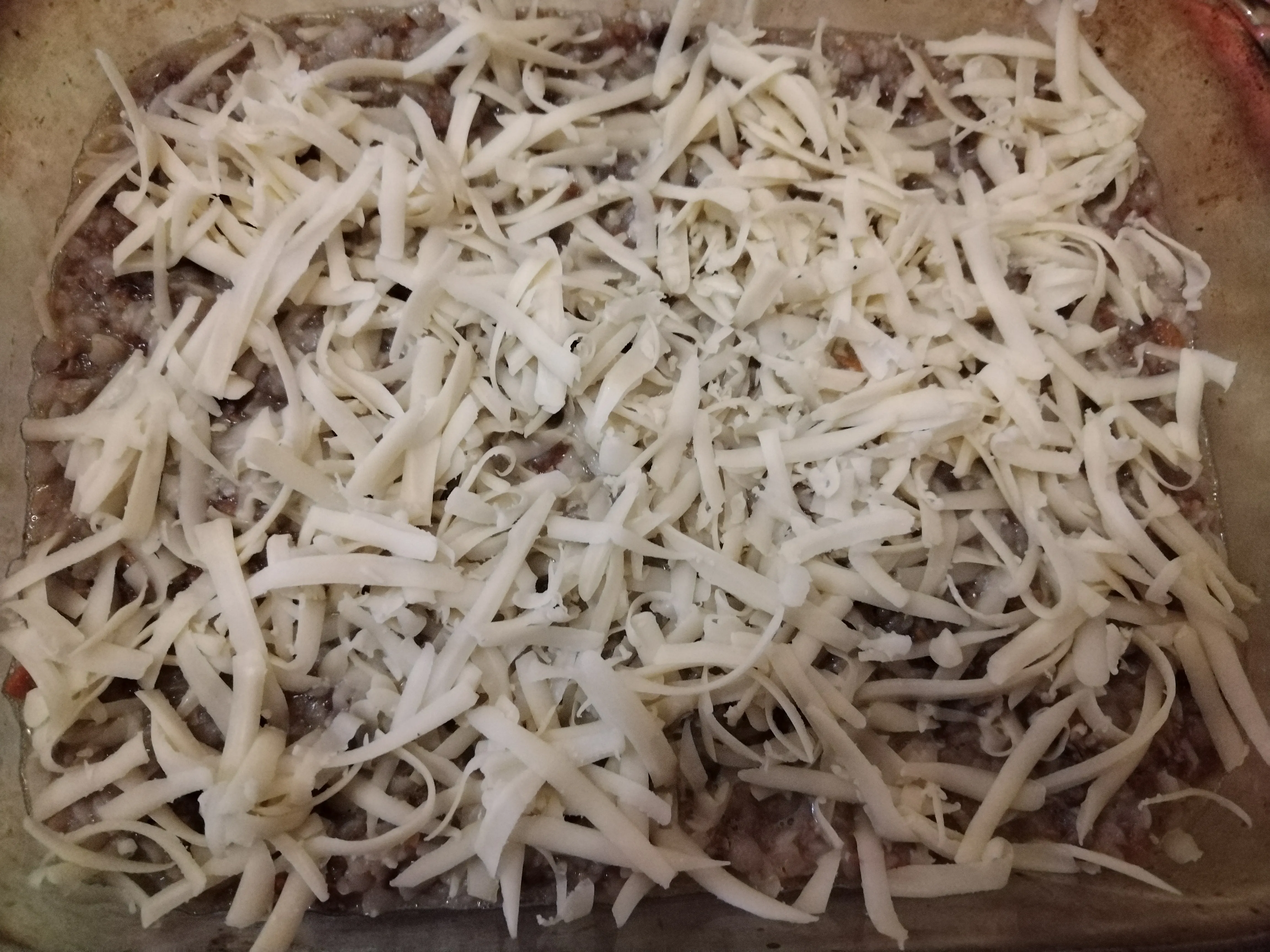 Приготовьте заливку: в отдельной миске взбейте яйца с солью и перцем, добавьте сметану, перемешайте до однородности. Залейте яично-сметанную смесь в форму с гречкой и печенью. Сверху засыпьте тёртым сыром.