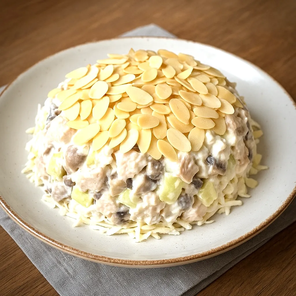 Смешайте салат с соусом. Украсьте сверху горстью миндальных лепестков.
