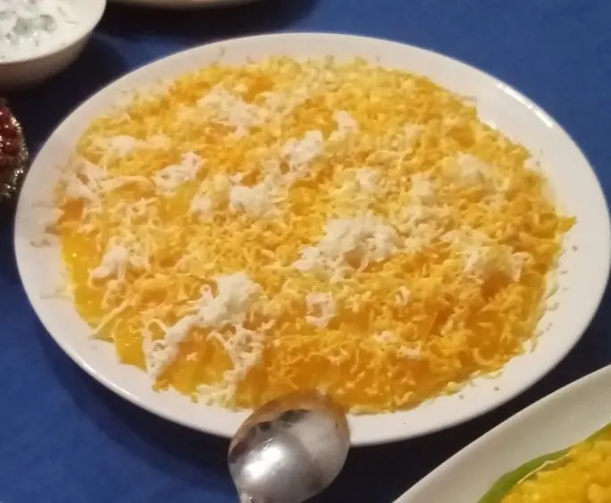 Далее выложите лук, затем слой сыра, далее — апельсин (почищенный и порезанный на треугольники). Повторите все слои. Между слоями с апельсином смажьте майонезом. Сверху украсьте тёртым желтком.