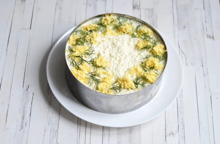 Рыбу разомните вилкой, удалив крупные кости. Выложите четвёртым слоем, покройте майонезом. Желтки натрите на мелкой тёрке, посыпьте сверху. Можно добавить зелень для украшения. Охладите и подавайте к столу.