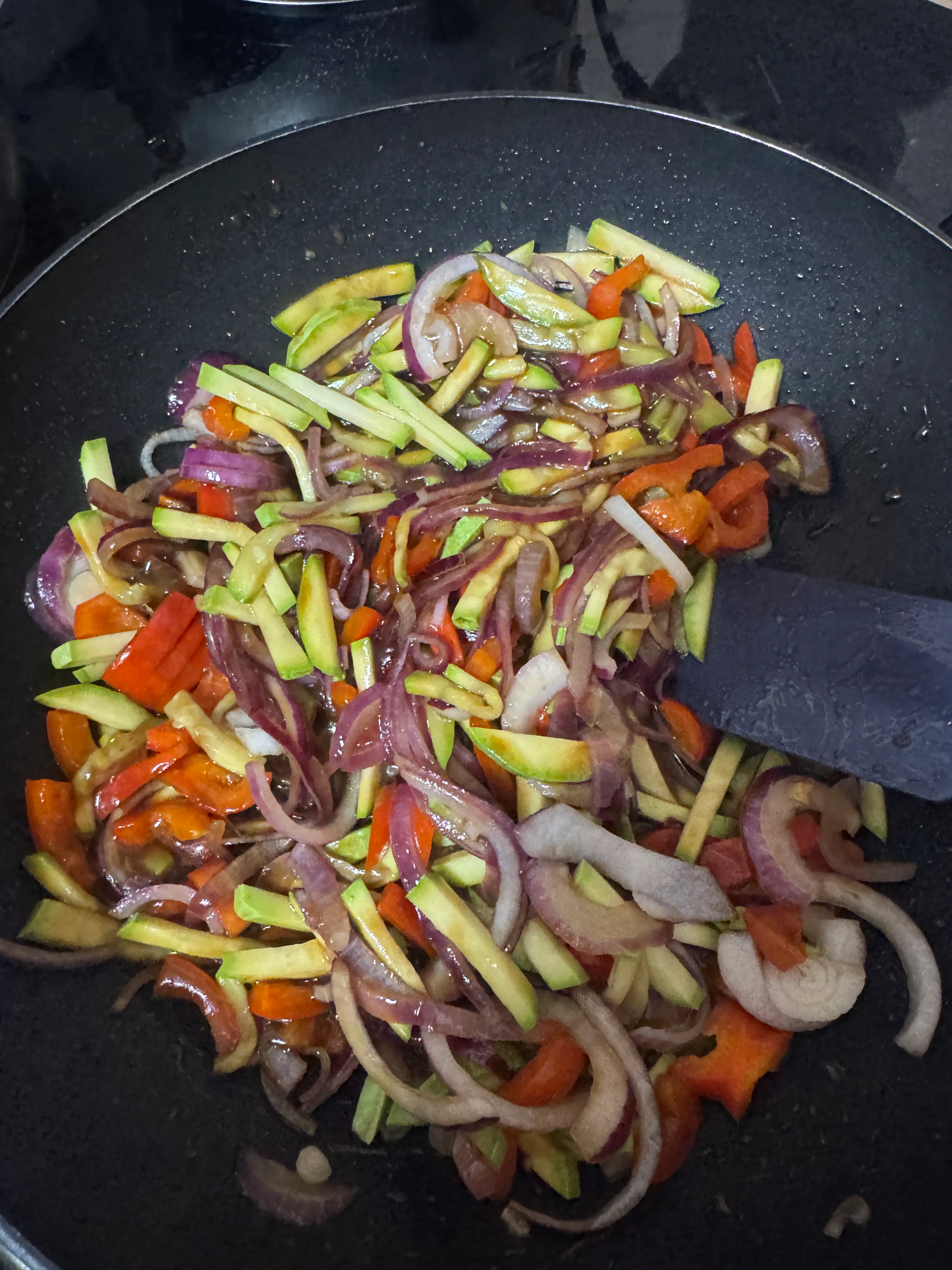 Смешайте всё в сковороде, добавьте пару ложек соуса, тушите несколько минут.