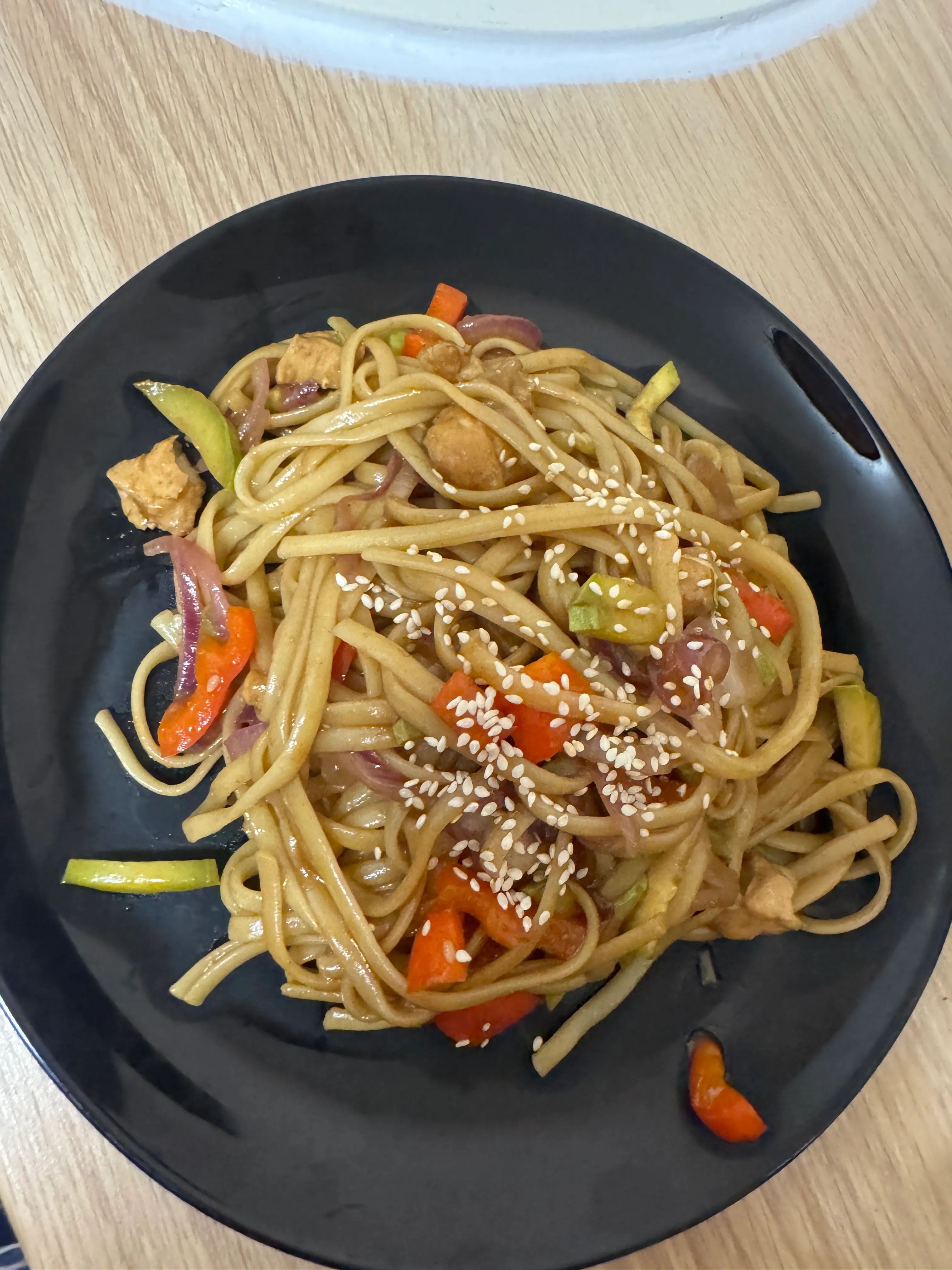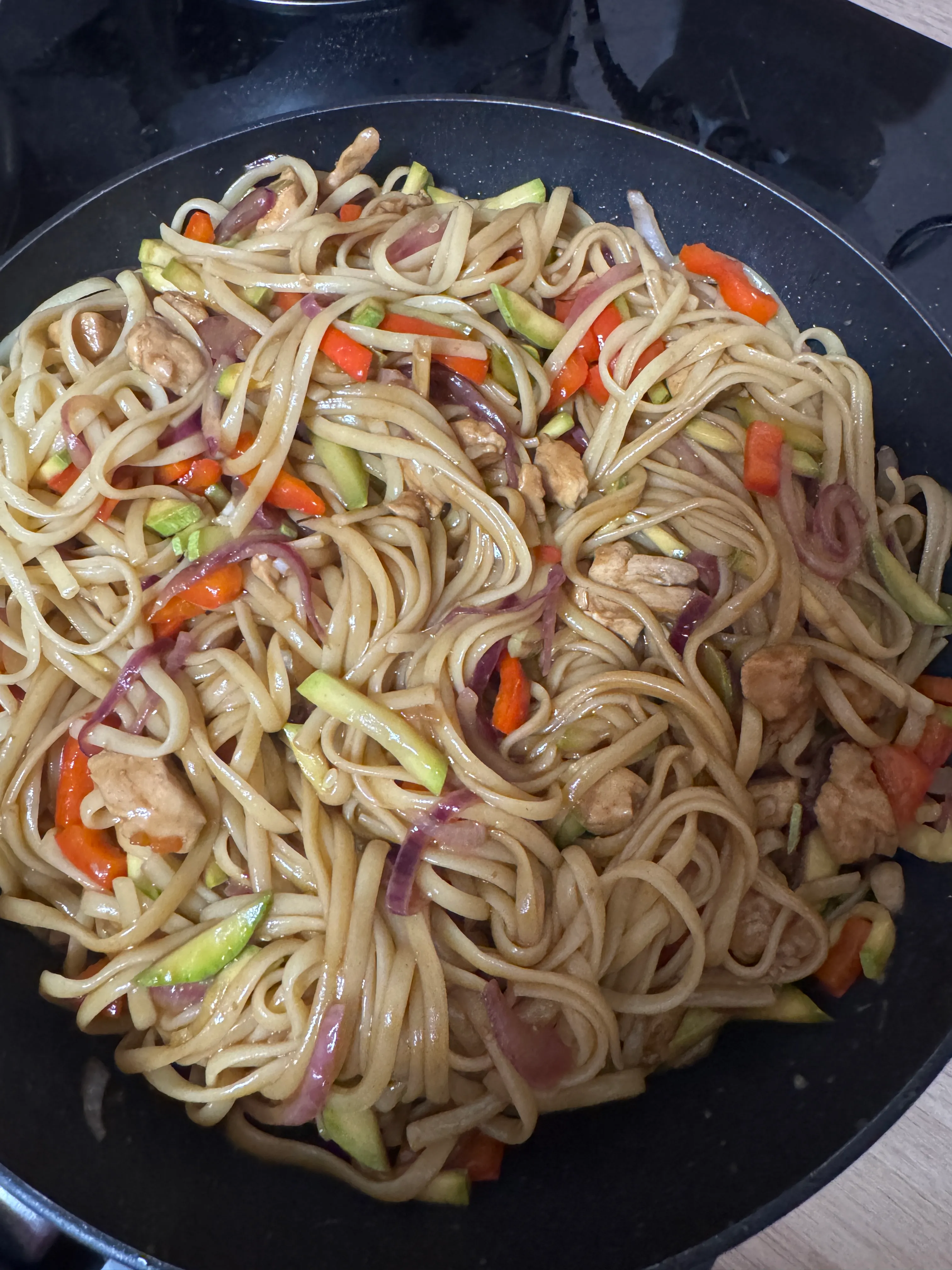 Сварите лапшу и обжарьте на сковороде курицу, нарезанную кубиками. Когда курица подрумянится, добавьте несколько ложек соуса терияки и потушите в нём. Соль добавьте по вкусу.
