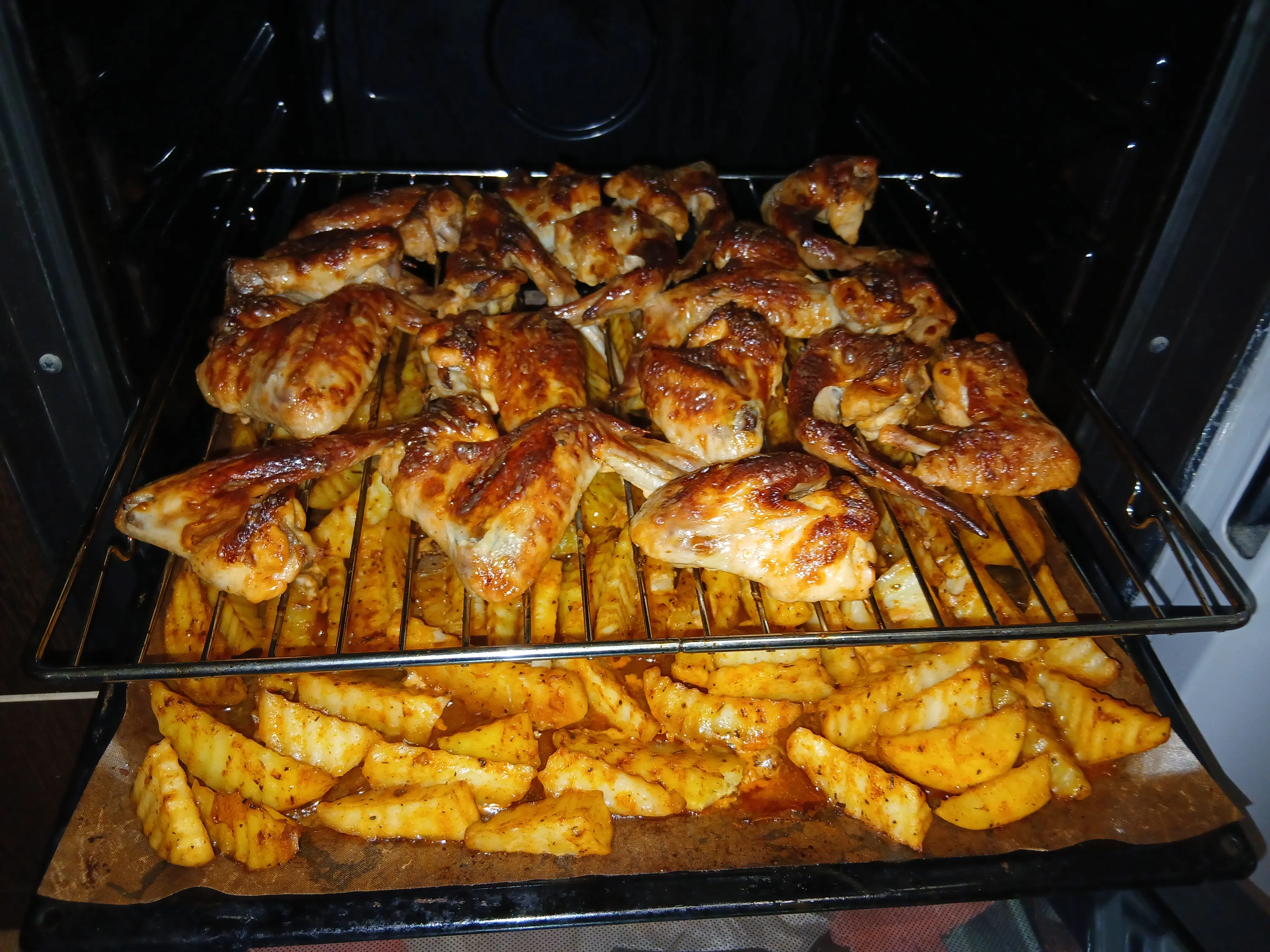 Выложите на противень картофель, а на решётку — крылья. Готовьте в духовом шкафу 45-60 минут.