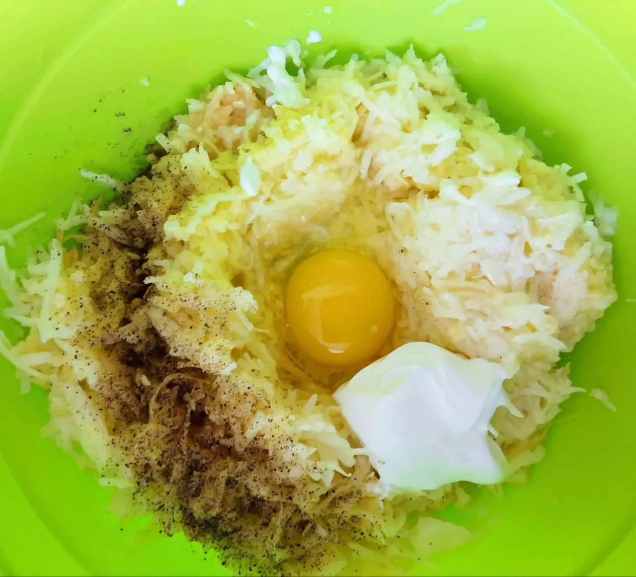 Картофель и лук очистите, натрите на тёрке. Добавьте сметану, перемешайте. Откиньте на дуршлаг, уберите лишнюю воду, отжав. Добавьте яйцо, соль, перец чёрный молотый. Перемешайте.