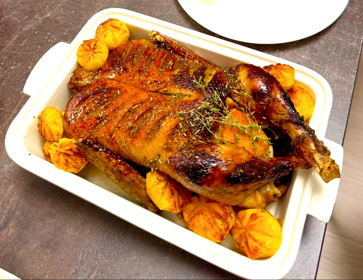 Готовую утку достаньте из духовки и полейте сверху приготовленной горячей смесью. Готово!