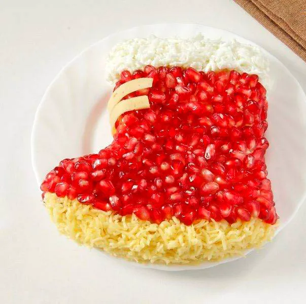 Выложите салат в виде сапога на подходящем блюде. Украсьте гранатом, мех сапога сделайте из белка, подошву из натёртого сыра, а застёжку из ломтиков сыра.