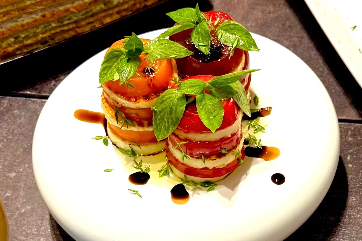Когда сыр немного остынет, соберите пирамидки по порядку: помидор, сыр, помидор, сыр, помидор. Украсьте блюдо базиликом и листьями тимьяна. Добавьте немного бальзамического соуса.