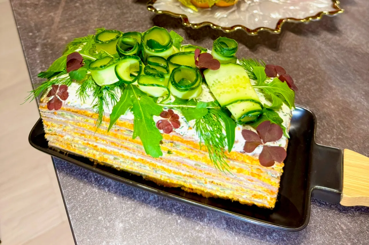 Сверху украсьте зеленью и слайсами свежего огурца.