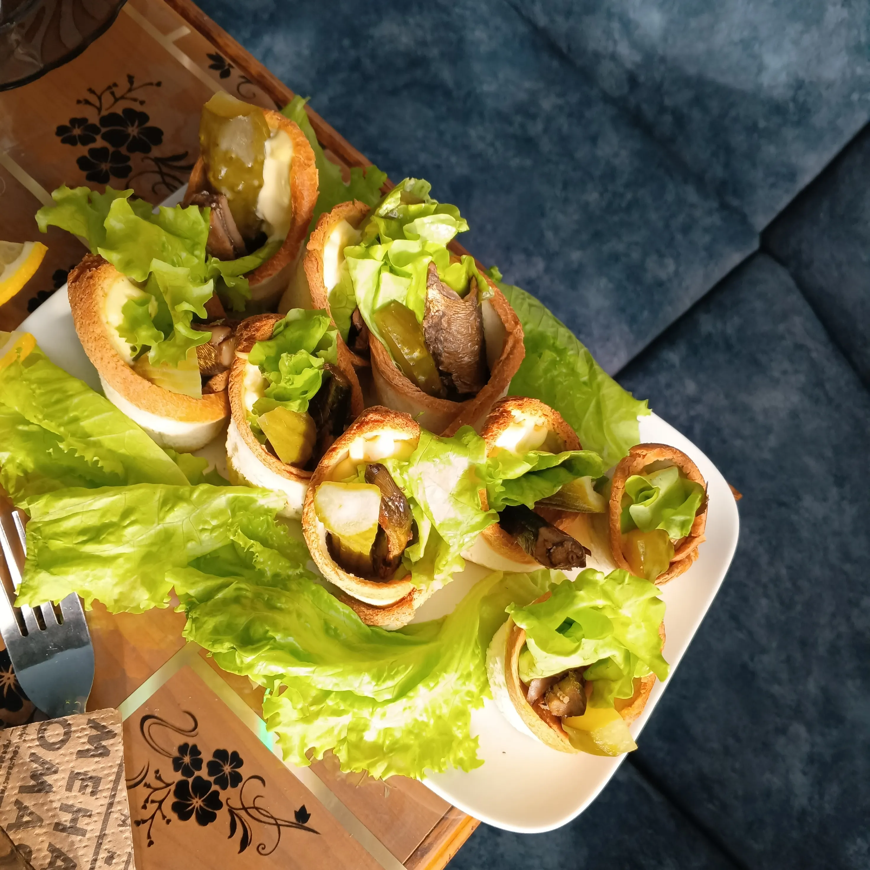 Переходите к сборке закуски. Внутрь хлеба выложите немного майонеза, затем вставьте лист салата, ломтик корнишона и рыбу.