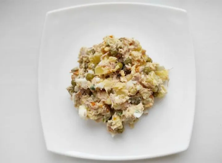 Оливье с тунцом — это вариация классического салата, где мясо или колбаса заменяются консервированным тунцом. Такой вариант получается более лёгким и нежным, сохраняя при этом узнаваемый вкус.