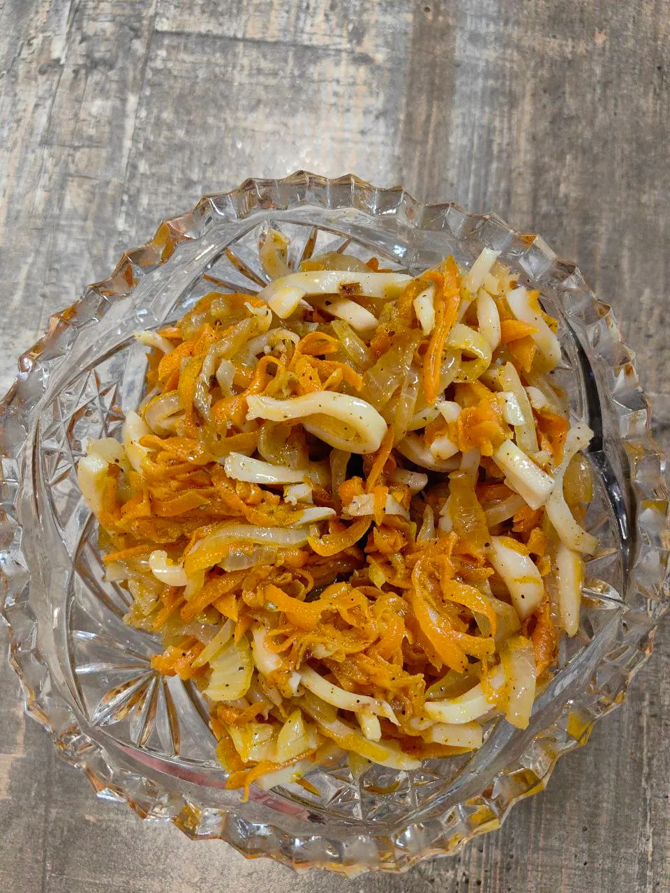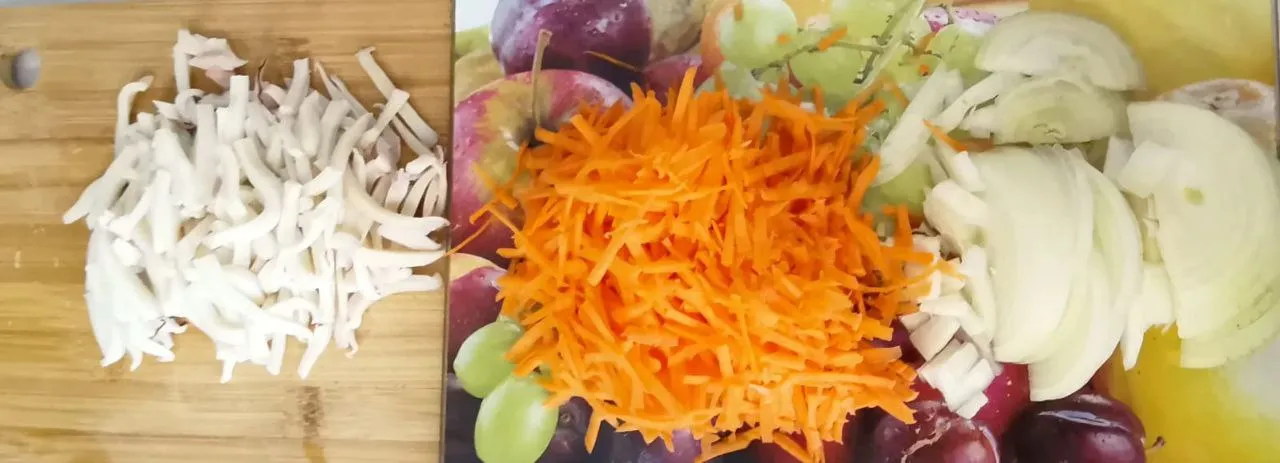 Приготовьте все ингредиенты салата. Лук нарежьте полукольцаим, морковь натрите на тёрке, кальмары порежьте брусочками.