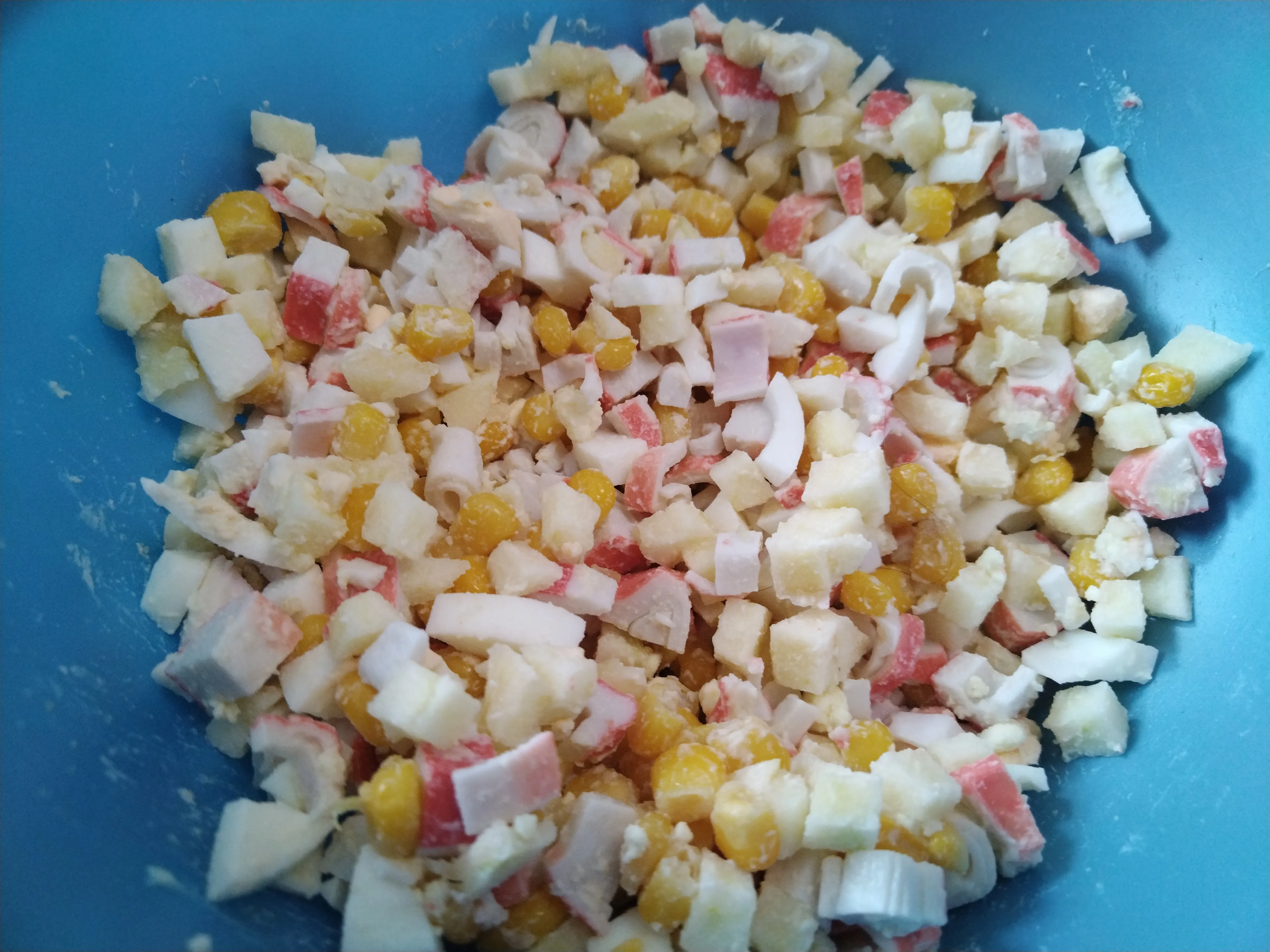 Соедините в миске яйцо, яблоки, палочки, добавьте кукурузу.