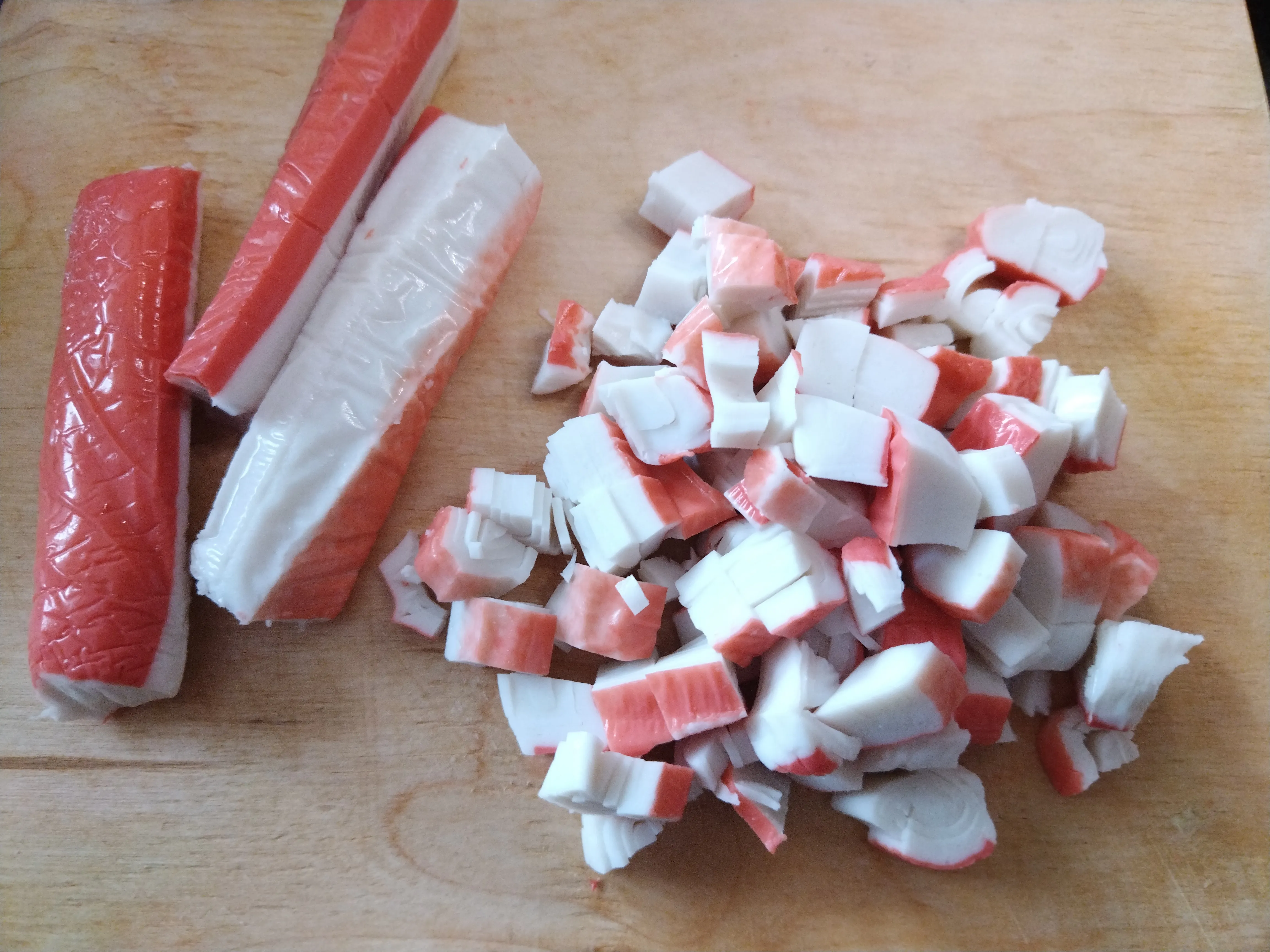 Крабовые палочки нарежьте кубиками.