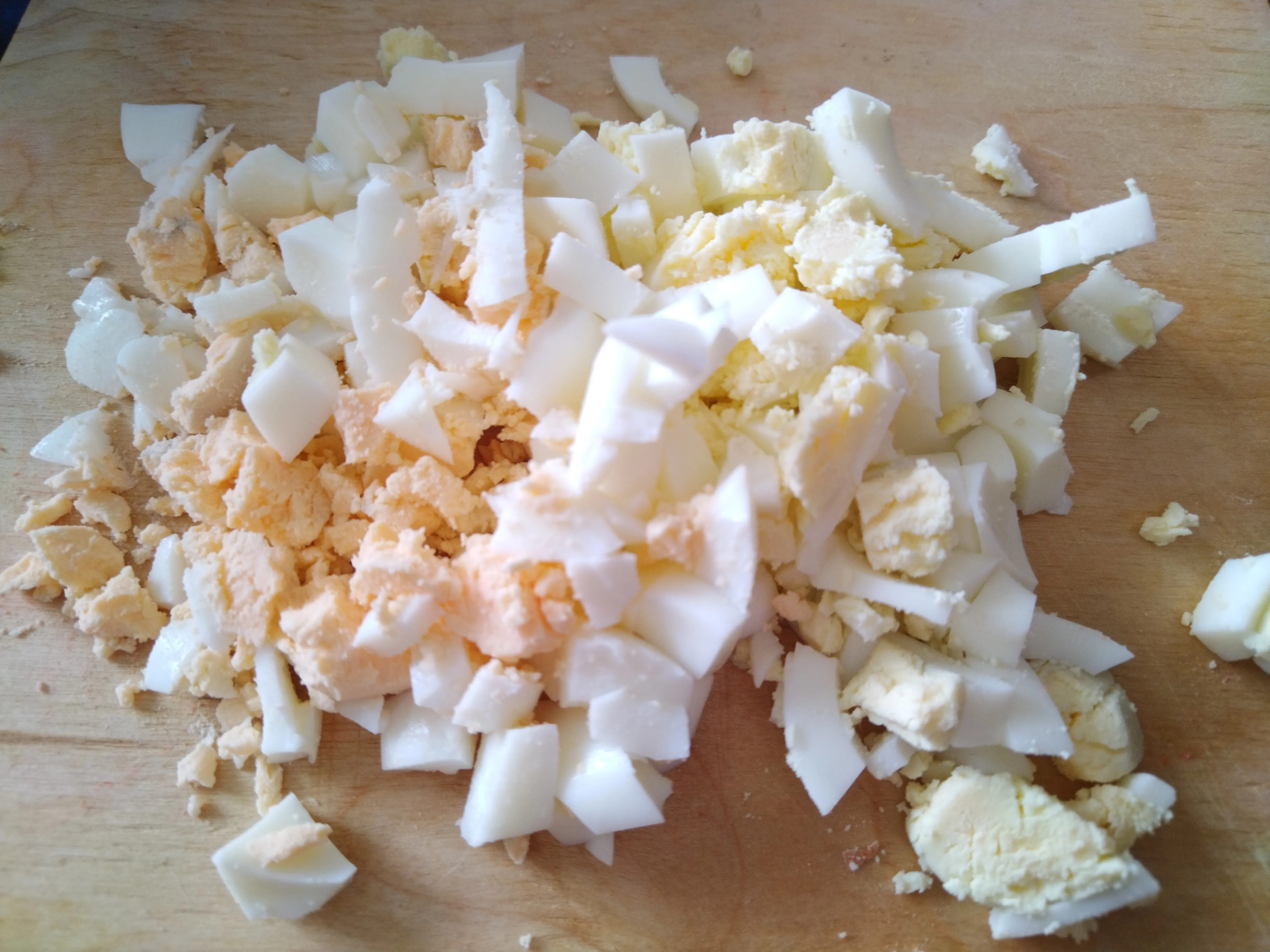Яйца сварите, остудите. Нарежьте кубиками.