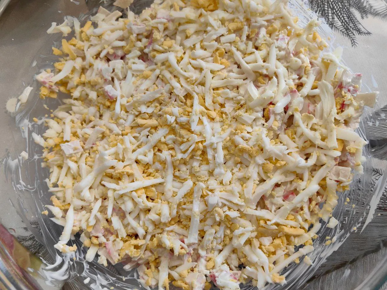 Яйца отварите, очистите, натрите на крупной тёрке. Выложите вторым слоем и смажьте майонезом.