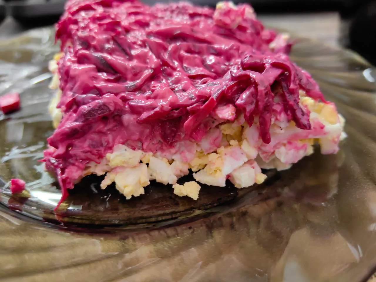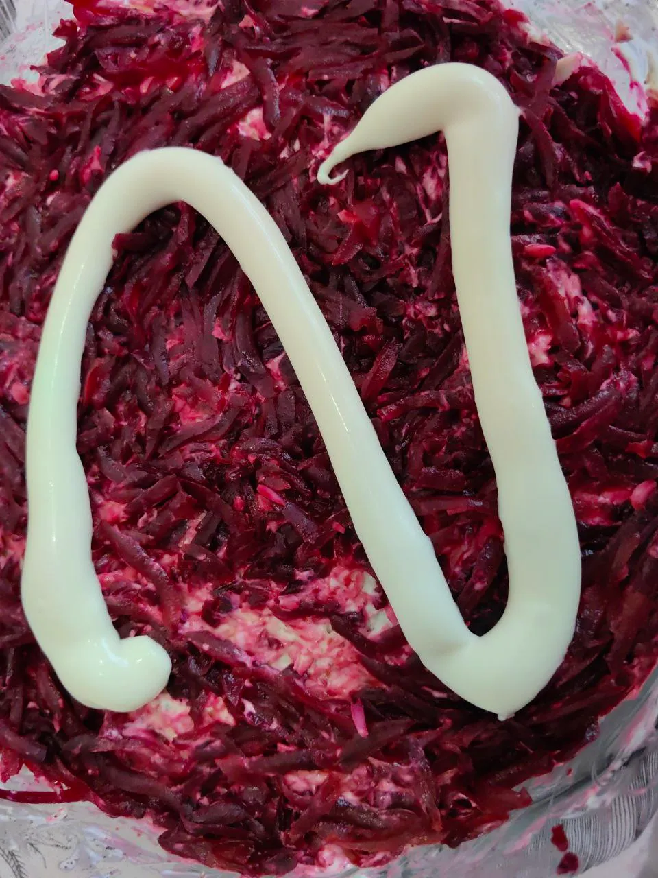 Варёную свёклу натрите на тёрке, выложите поверх сыра, промажьте майонезом. Салат готов. Можно украсить по своему вкусу. Приятного аппетита!