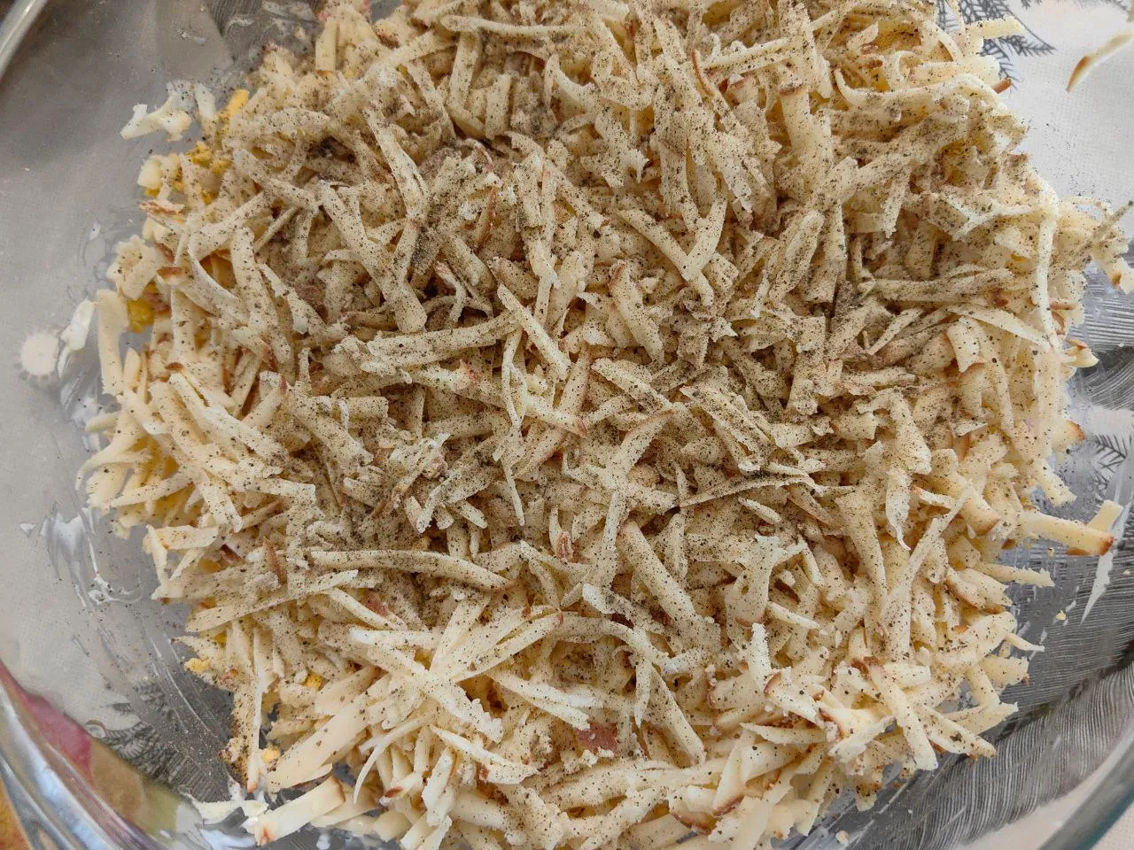 Колбасный копчёный сыр натрите на тёрке, выложите поверх яйца, посыпьте чёрным молотым перцем, промажьте слой майонезом.
