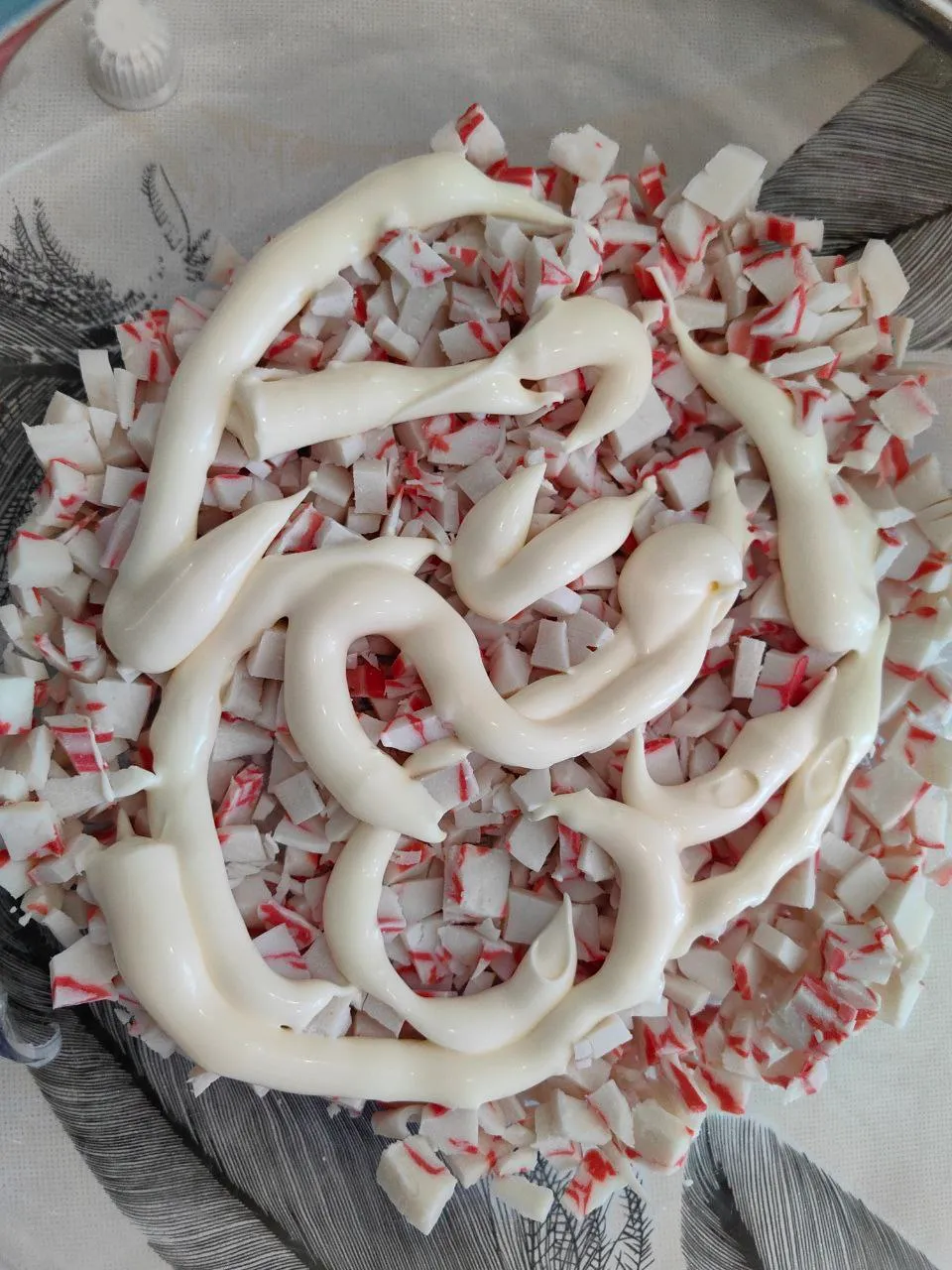Салат выкладывается в блюдо слоями. Для первого слоя нарежьте крабовые палочки кубиком. Промажьте майонезом.