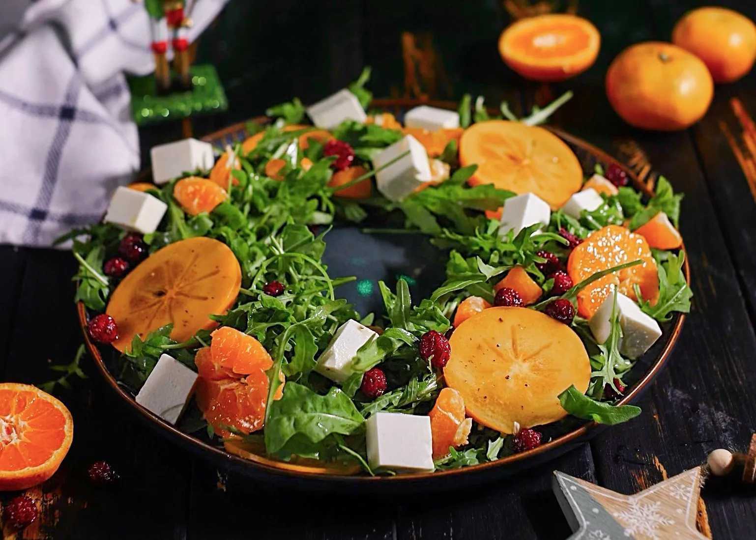 У этого салата очень яркий и насыщенный вкус: кисло-сладкие фрукты, сладкая клюква, рукола с лёгкой горчинкой, мягкая текстура творожного сыра. Когда для себя открывать новый вкус, как не на Новый год! Есть ещё плюсы: салат готовится считанные минуты, и его подача очень праздничная.