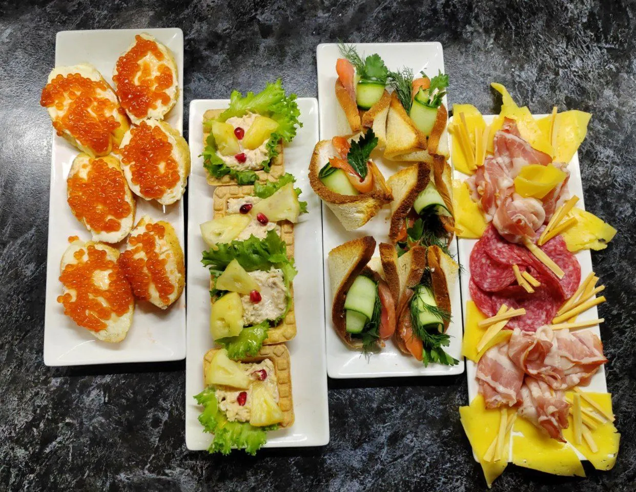 Классические бутерброды с икрой, тарталетки с тунцом и ананасом, треугольники с красной рыбой, огурцом и зеленью, сырно-колбасная нарезка. Добавьте их на свой стол, чтобы порадовать гостей! Готовится всё очень быстро и просто!
