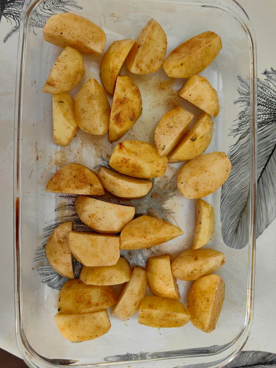 Картофель очистите, нарежьте дольками, посолите, перемешайте с приправой и растительным маслом. Выложите в форму для запекания.
