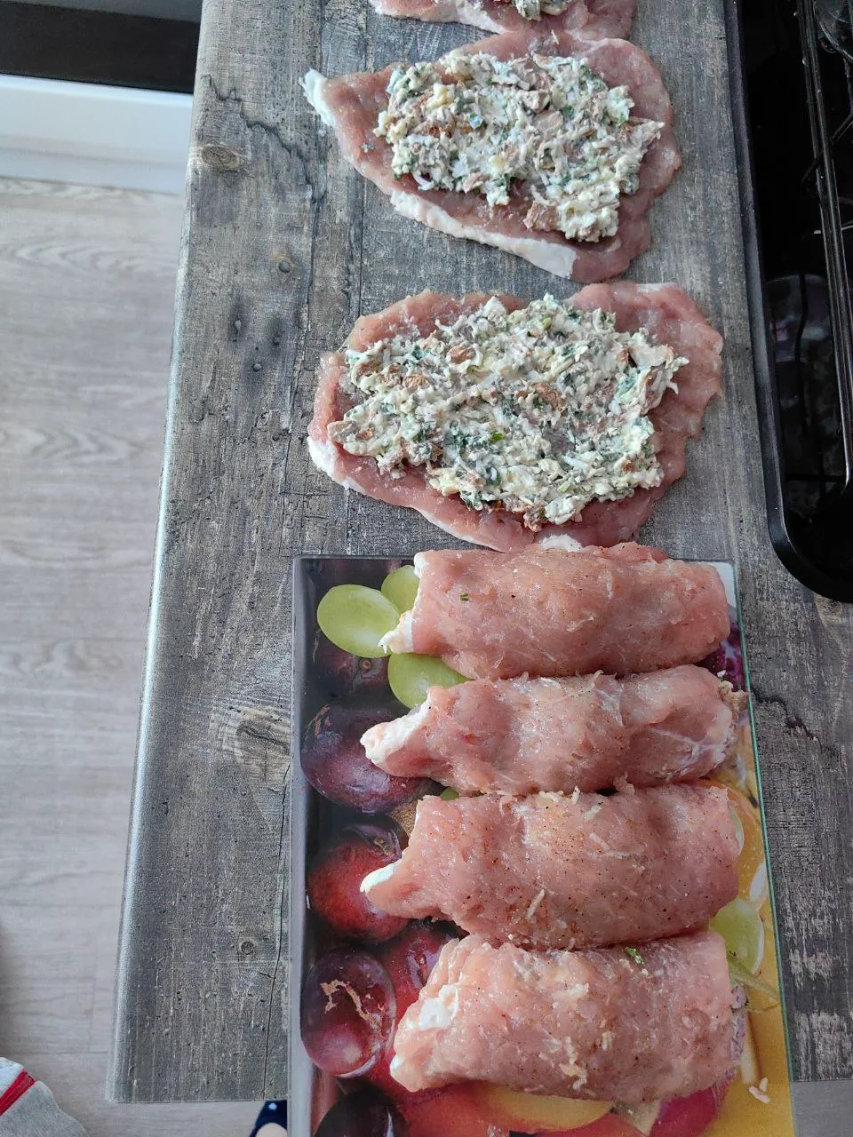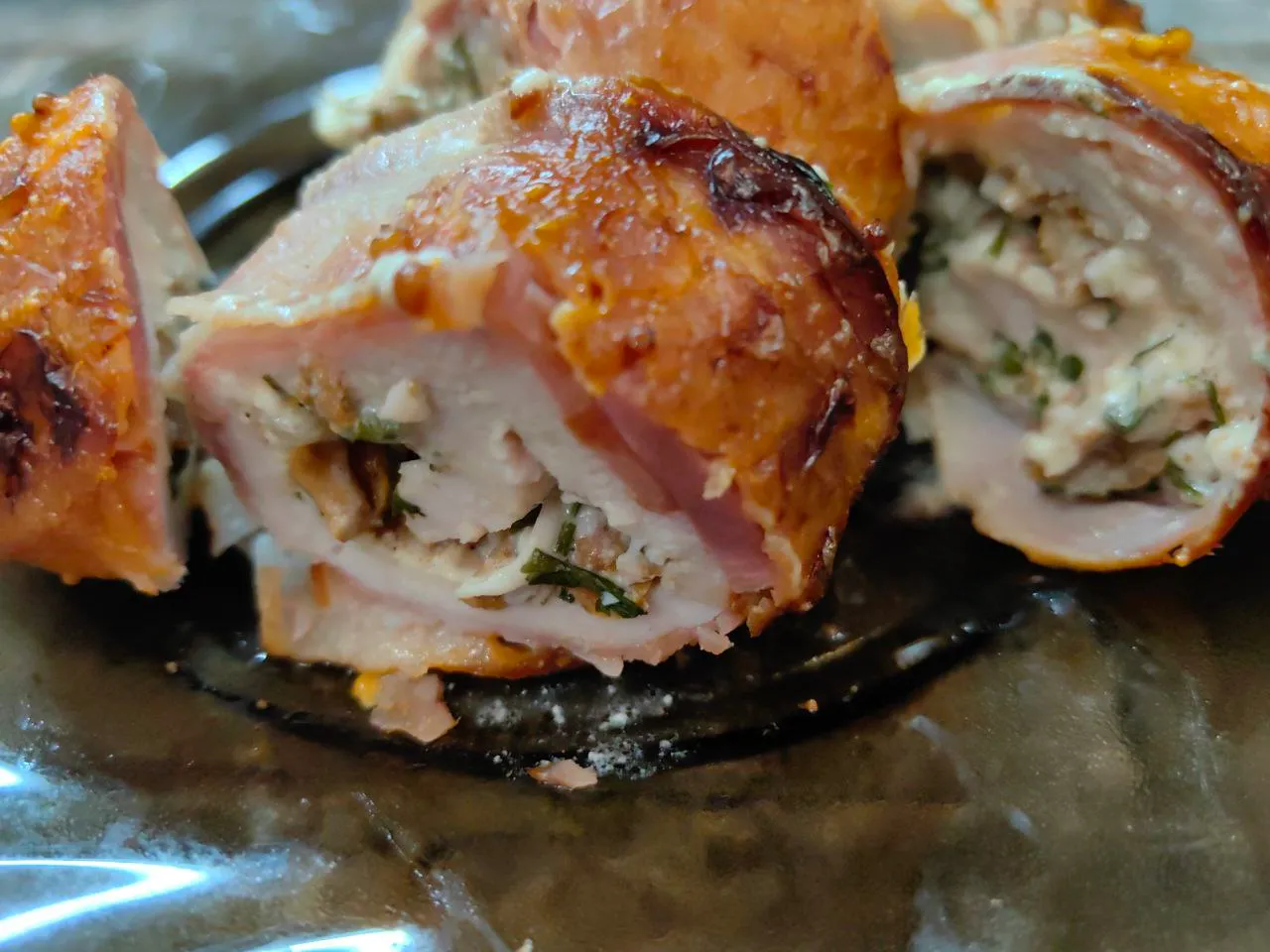 На стейки выложите начинку, сверните каждый в рулет. Рулеты оберните беконом.