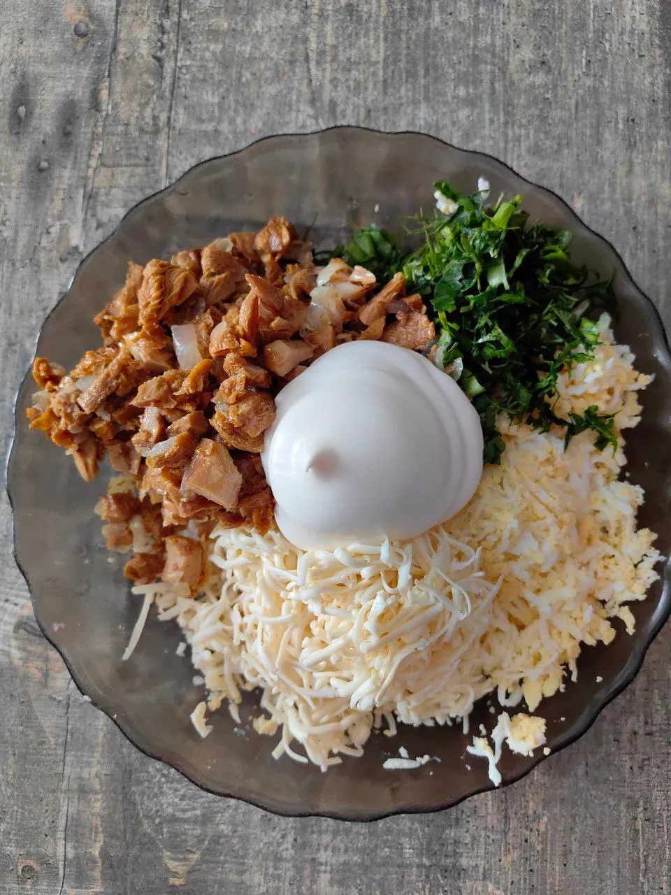 Яйцо отварите, натрите на тёрке. Грибы, яйцо, плавленный натёртый сыр, измельчённую зелень смешайте и заправьте майонезом. Перемешайте ещё раз.
