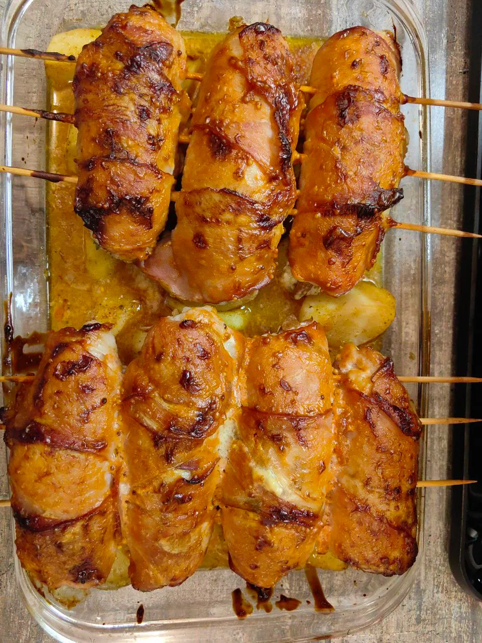 Смажьте рулеты соусом терияки, отправьте в разогретую до 180°C духовку на 40 минут. Через полчаса рулеты уберите, картофель перемешайте, верните рулеты на место и отправьте обратно в духовку на 220°C до румяности.