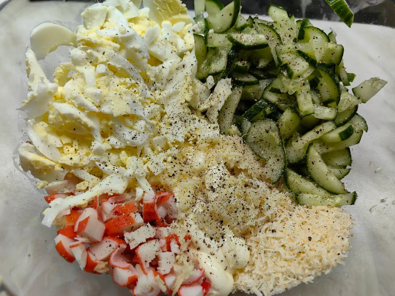 Твёрдый сыр натрите на крупной тёрке, крабовые палочки нарежьте кубиком. Огурец нарежьте соломкой. Выложите всё в салатник.