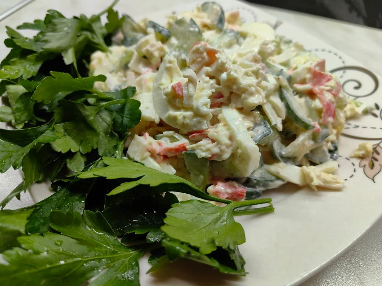Заправьте салат, перемешайте. Украсьте зеленью. Приятного аппетита!