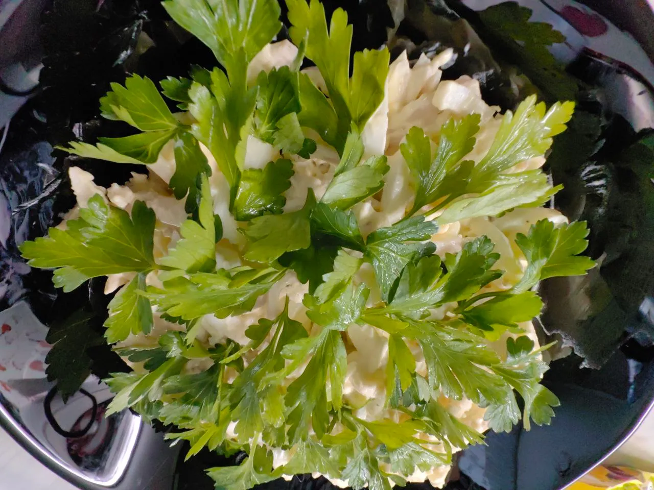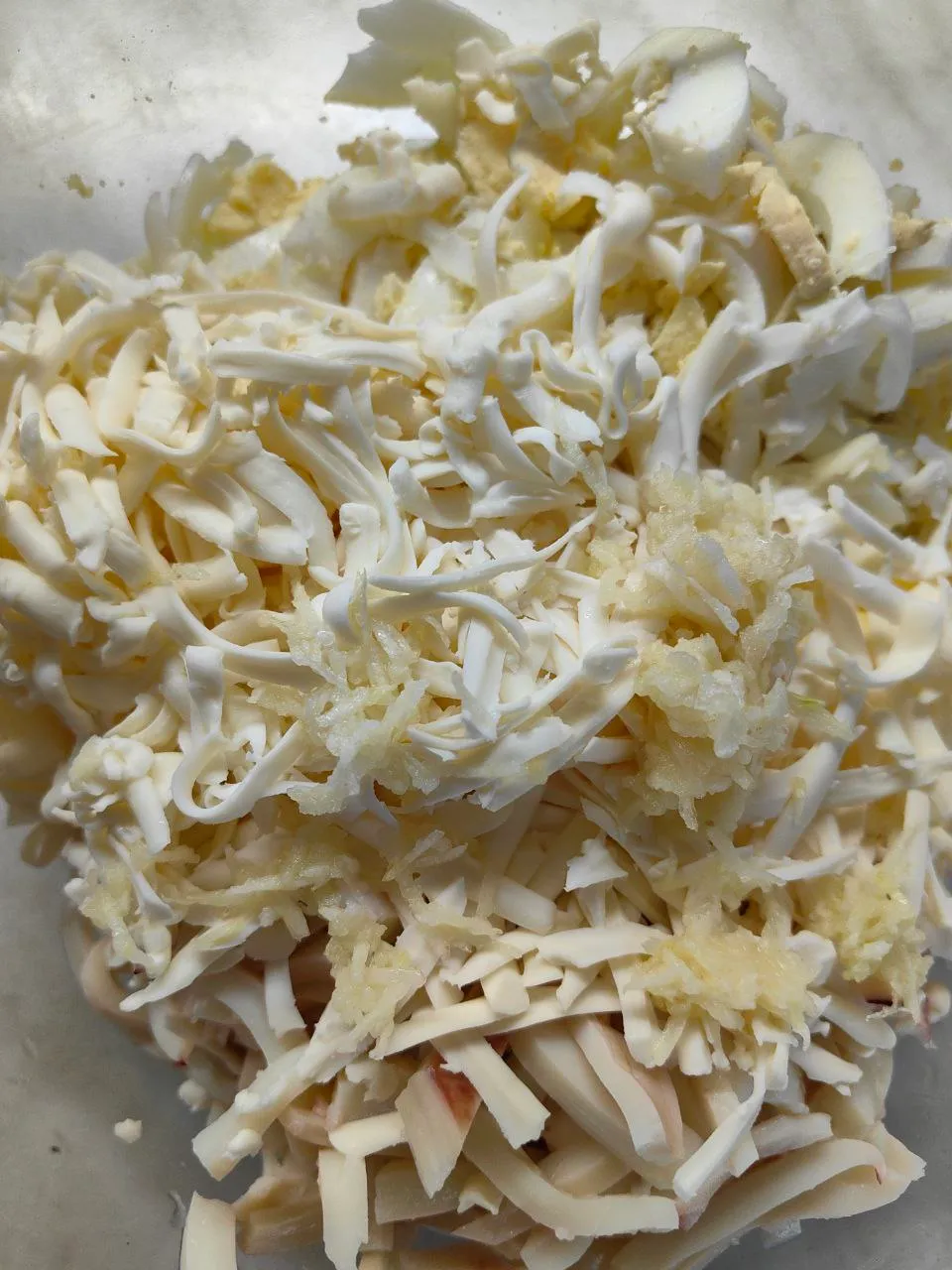 В салатник выложите сыр, яйца, кальмары, чеснок, петрушку и майонез, тщательно перемешайте и подавайте на стол. Приятного аппетита!