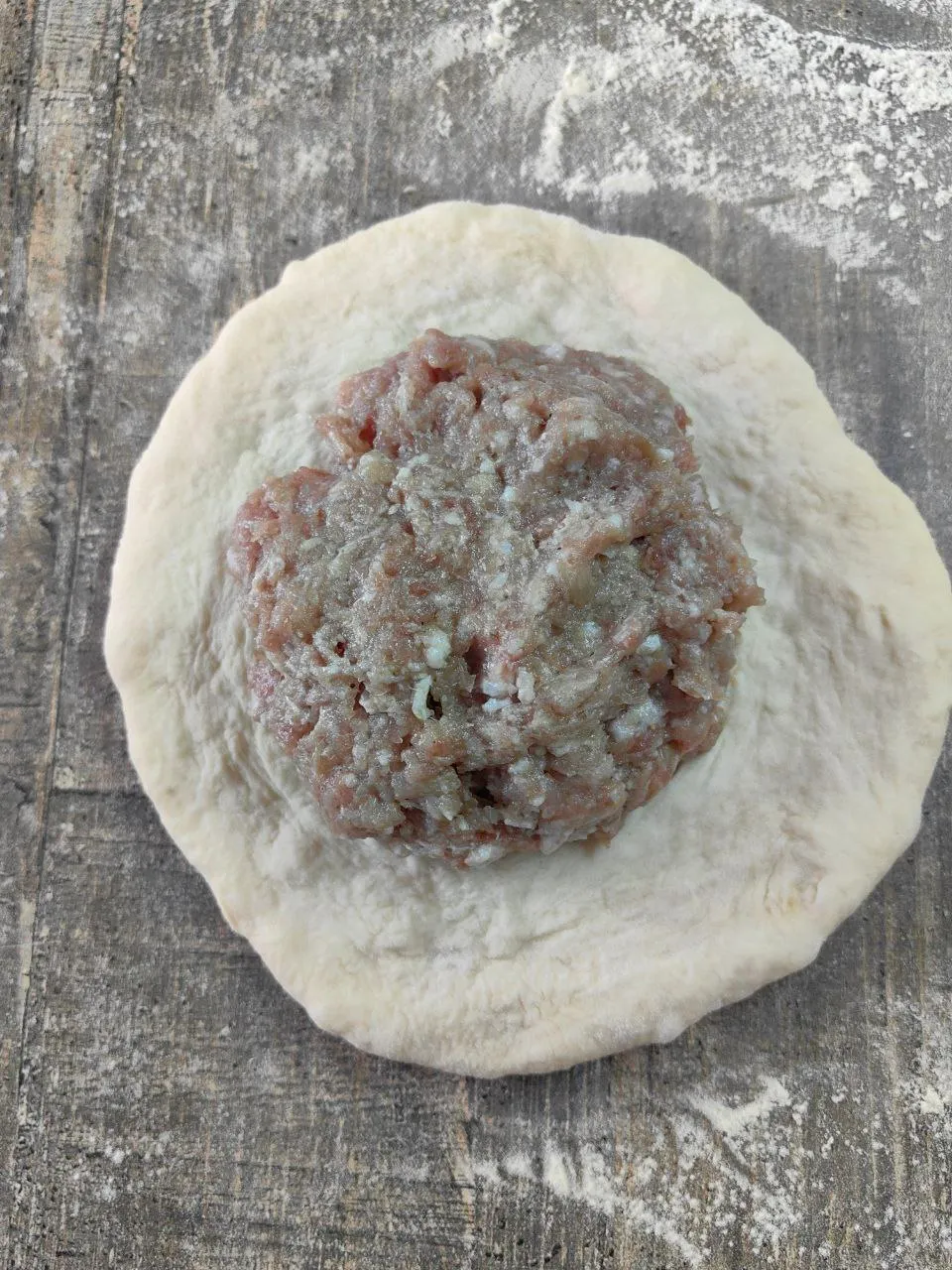 Стол присыпьте мукой, положите стороной защипа вниз. Сначала слегка разомните в лепёшку, затем посыпьте мукой и раскатайте до нужного диаметра. В центре сделайте отверстие.