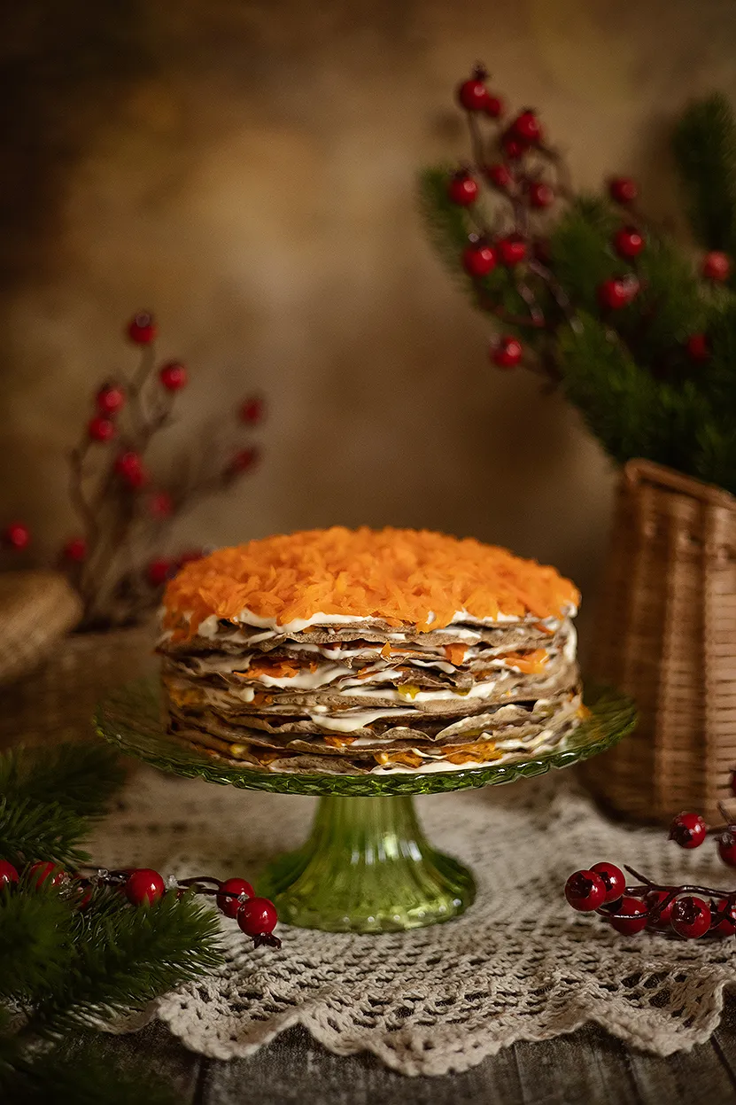 Печёночный торт — это изысканное и сытное блюдо, которое идеально подходит для новогоднего стола. Его многослойная структура и аппетитный внешний вид делают его настоящим украшением праздничного застолья!