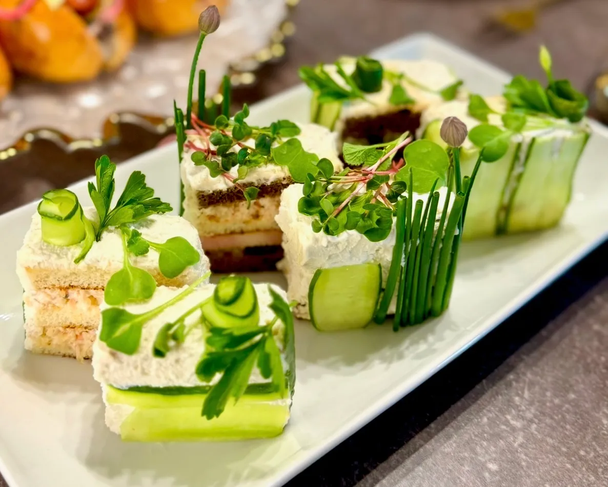 Сэндвичи украсьте слайсами огурца и зеленью.