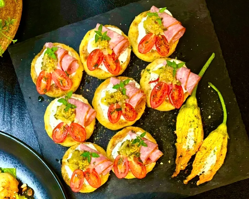 На остывшие картофельные оладьи нанесите творожный сыр и начинку по вкусу. Например, подойдёт обжаренный бекон с соусом Релиш.