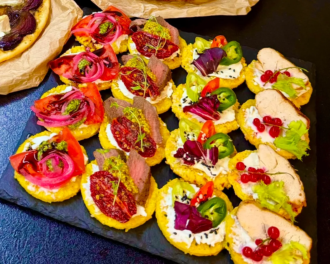 Можно выложить помидор с маринованным луком и соусом песто. Вкусным вариантом станет запечённая говядина с вялеными томатами и горчицей зёрнами. В начинке можно также использовать микс острых перцев. Можно приготовить запечённое куриное филе с красной смородиной.
