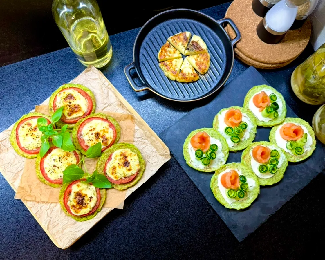 Второй вариант теста — картофельный. Отварите картофель до готовности, разотрите в пюре, добавьте две столовые ложки рисовой муки и два яйца, соль, хорошо перемешайте. С помощью круглой формочки отсадить оладьи на разделочную доску и уберите в морозилку на час.