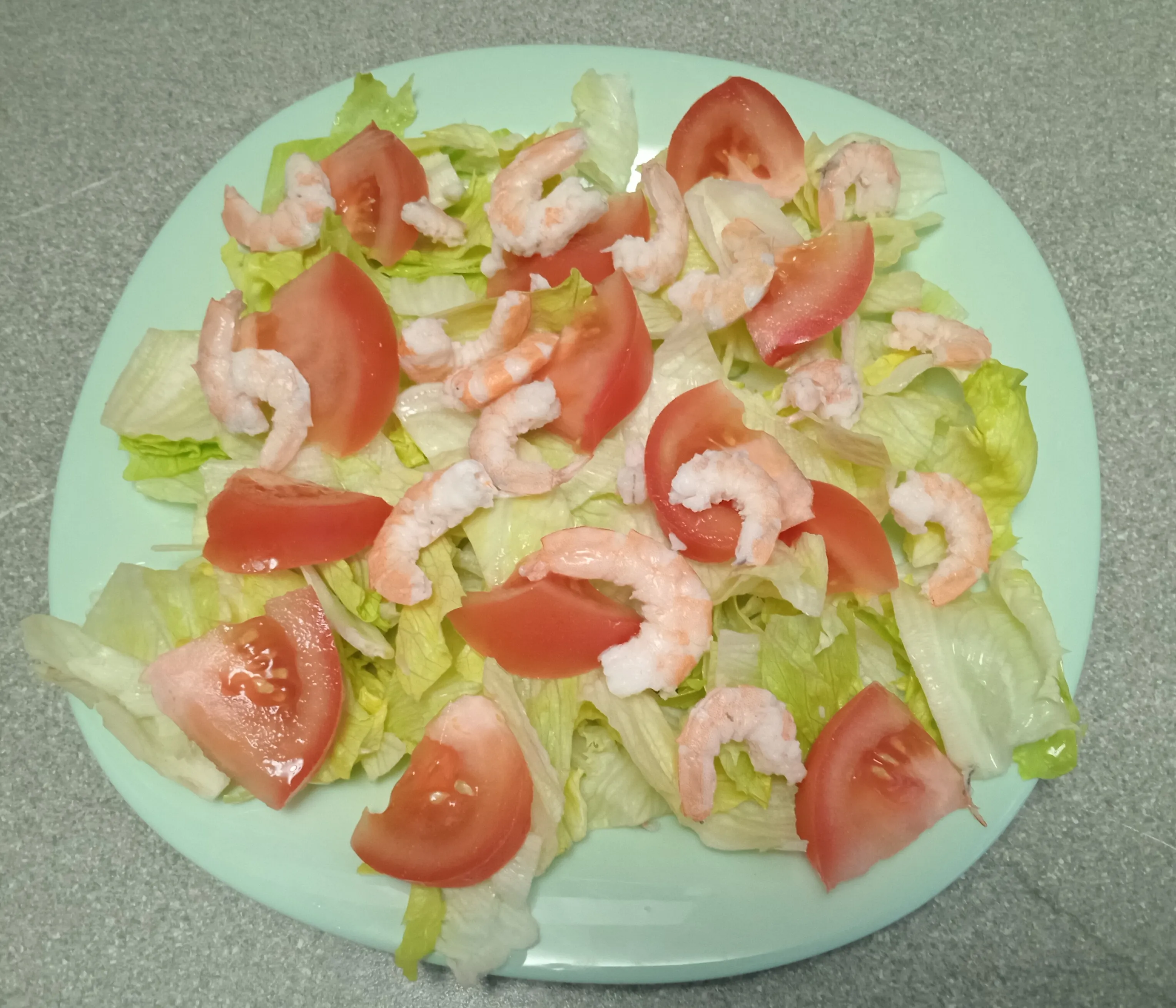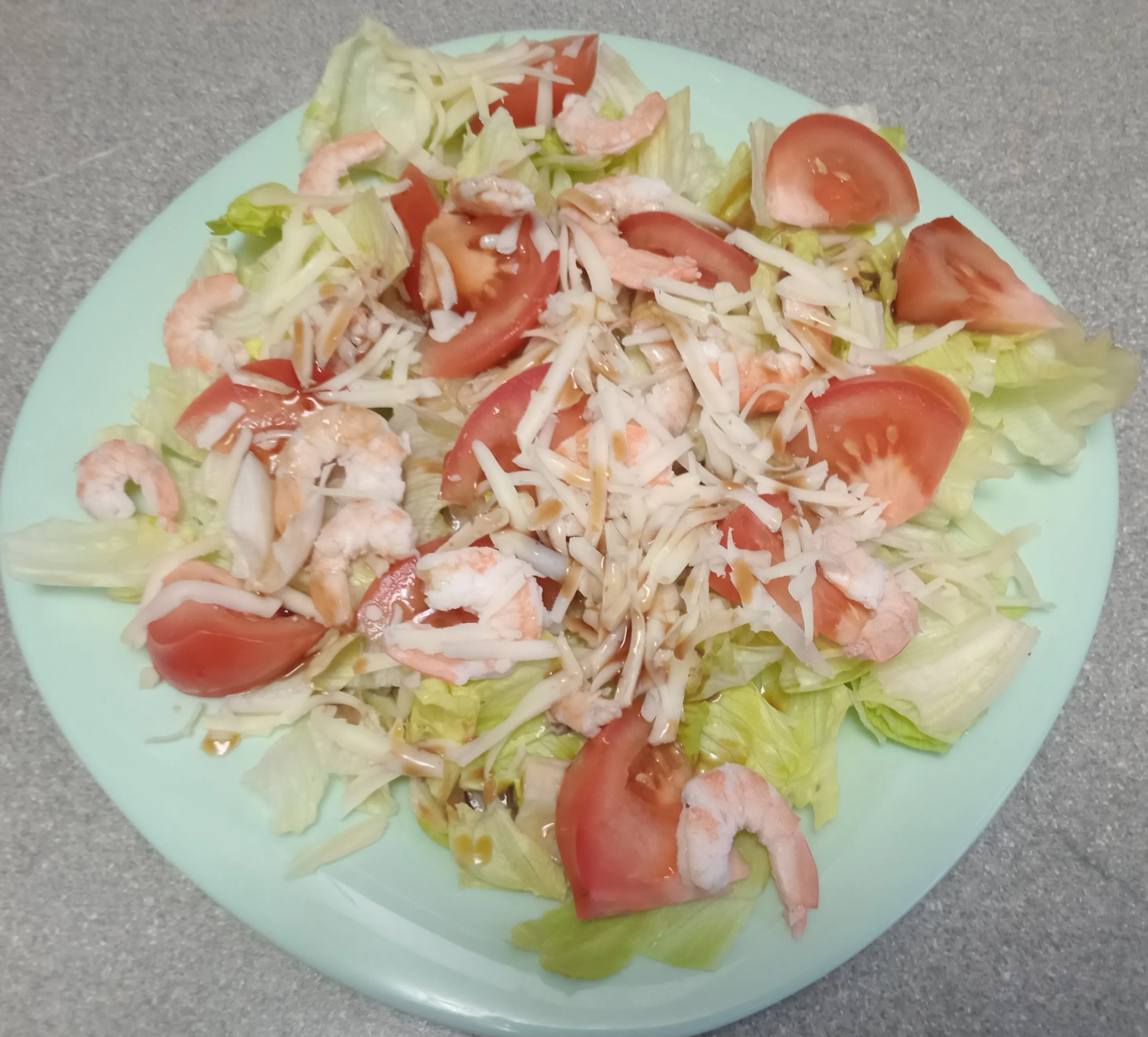 Салат Айсберг 120 гКреветки Королевские 120 гТомат (помидор) 100 гСыр твердый 60 г