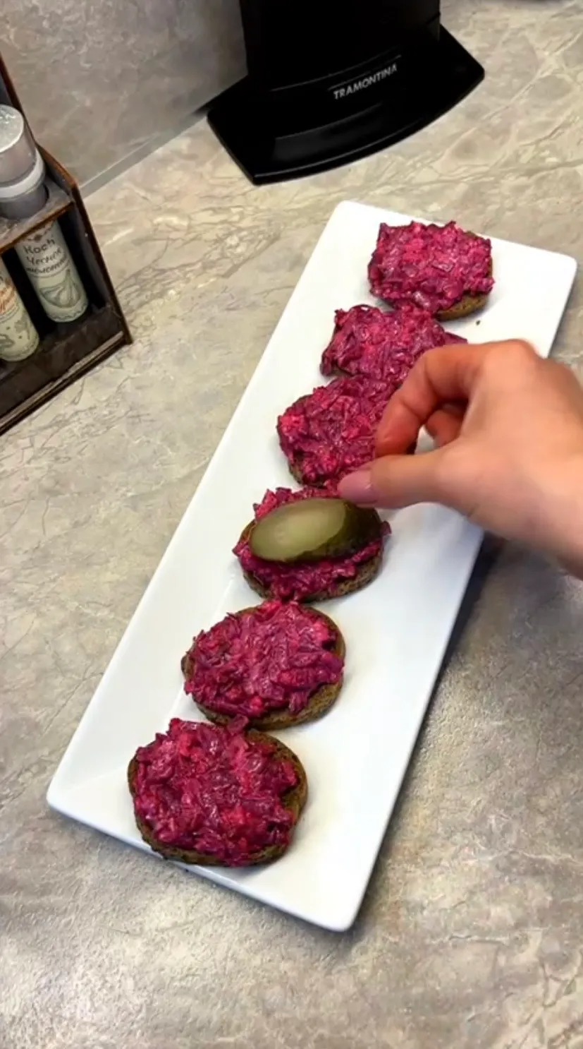 Любой ваш стол с ними будет выглядеть ярко, красиво и вкусно. Готовятся они очень просто и быстро. Потребуется: Свёкла отварная Чеснок Майонез Батон Селедка ( готовая в банках) Маринованные огурцы Красный лук Зернистая горчица Укроп Приятного аппетита ❤️