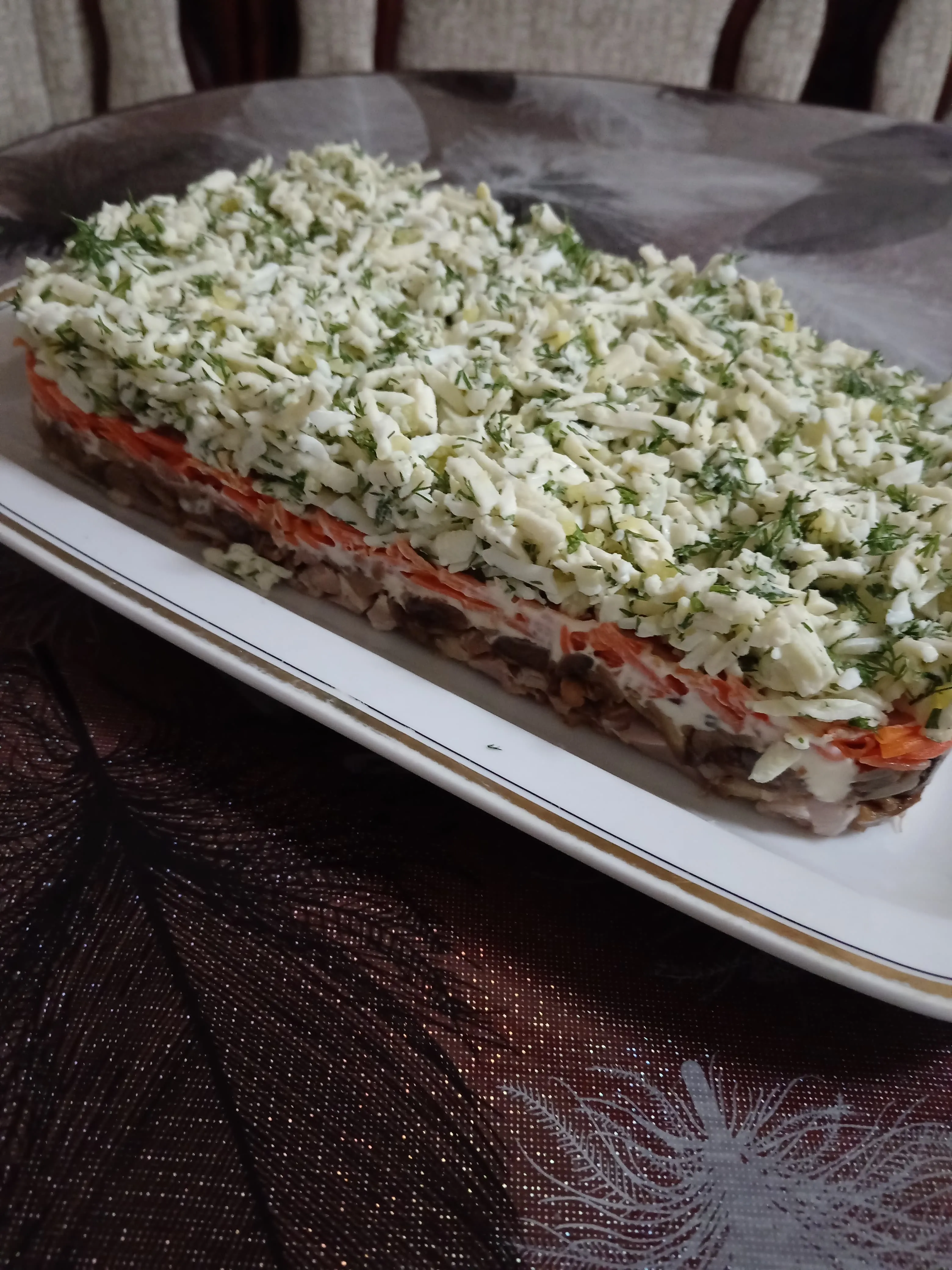 Выложите морковь по-корейски, предварительно отжав от лишнего маринада. Промажьте майонезом. Выложите яйцо. Накройте пищевой плёнкой, уберите в холодильник минимум на 4 часа.