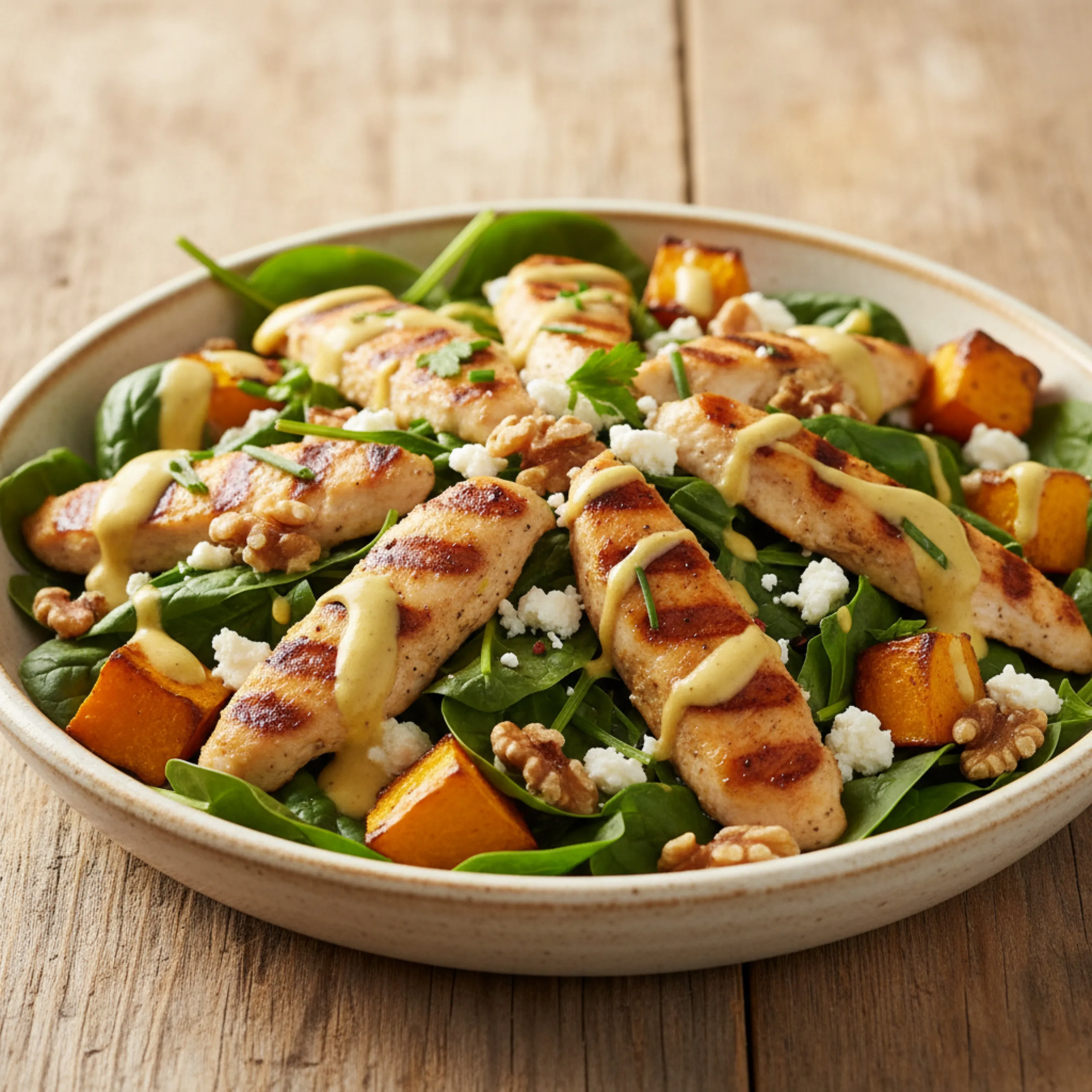 Этот салат — сочетание нежной курицы, сладкой запечённой тыквы, свежего шпината и мягкого сыра фета, украшенных хрустящими орехами. Заправка из мёда, горчицы и лимонного сока придаёт блюду лёгкую сладость и пикантность. Тёплый салат дарит уют и баланс вкусов — от сладкого и солёного до зелёного и орехового, создавая гармоничное, сытное и полезное блюдо. Предложите его гостям на новогоднем столе!