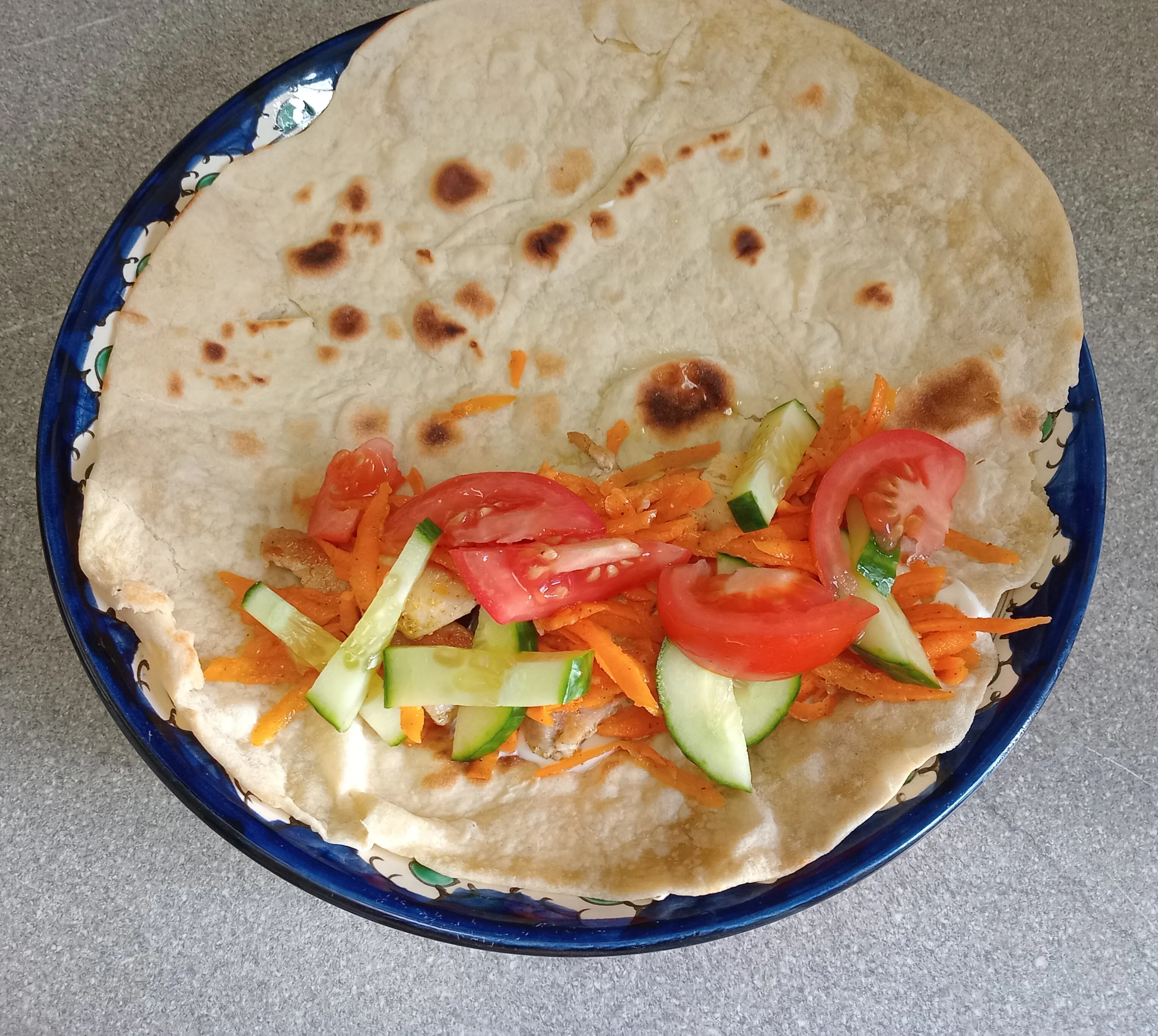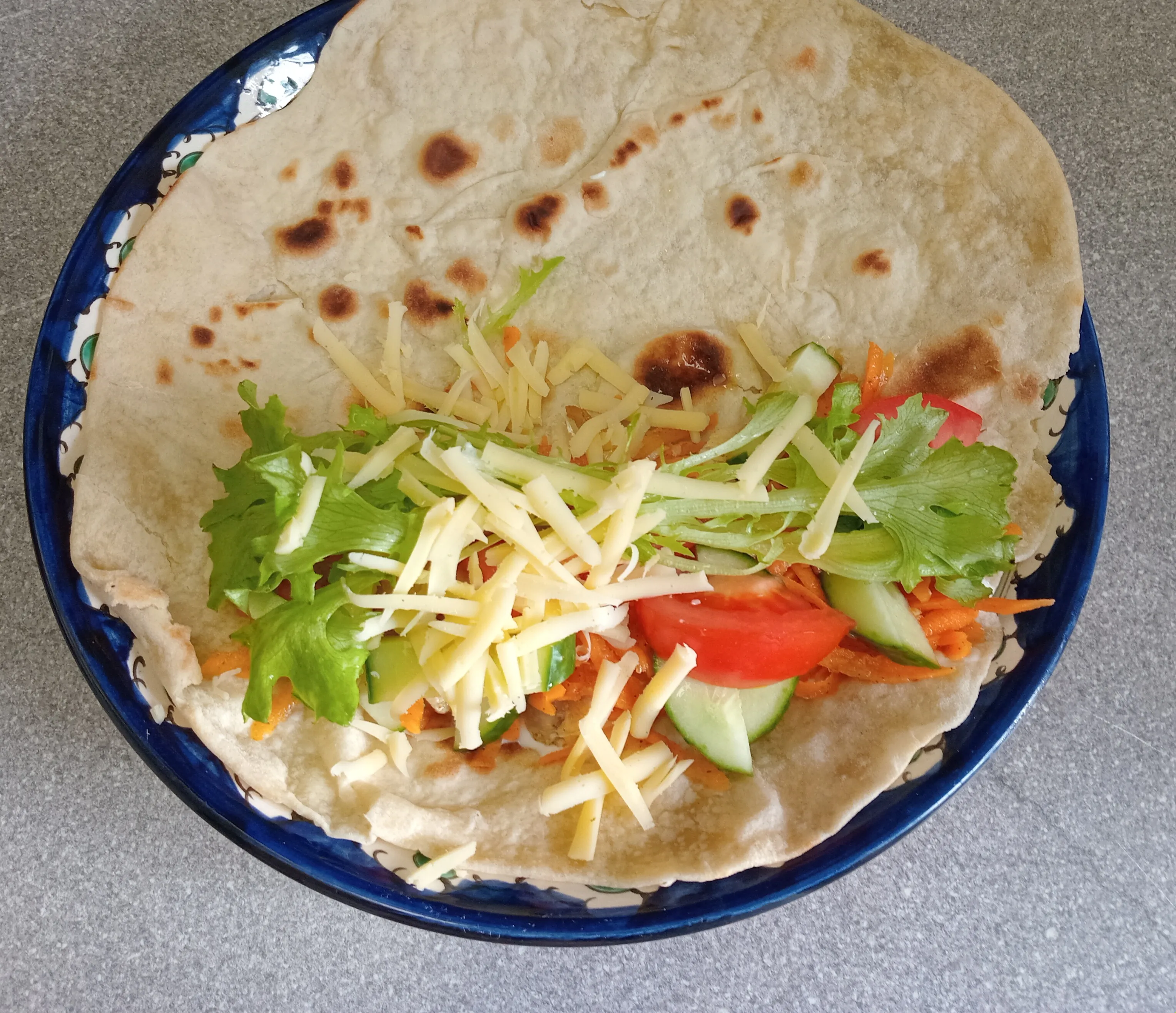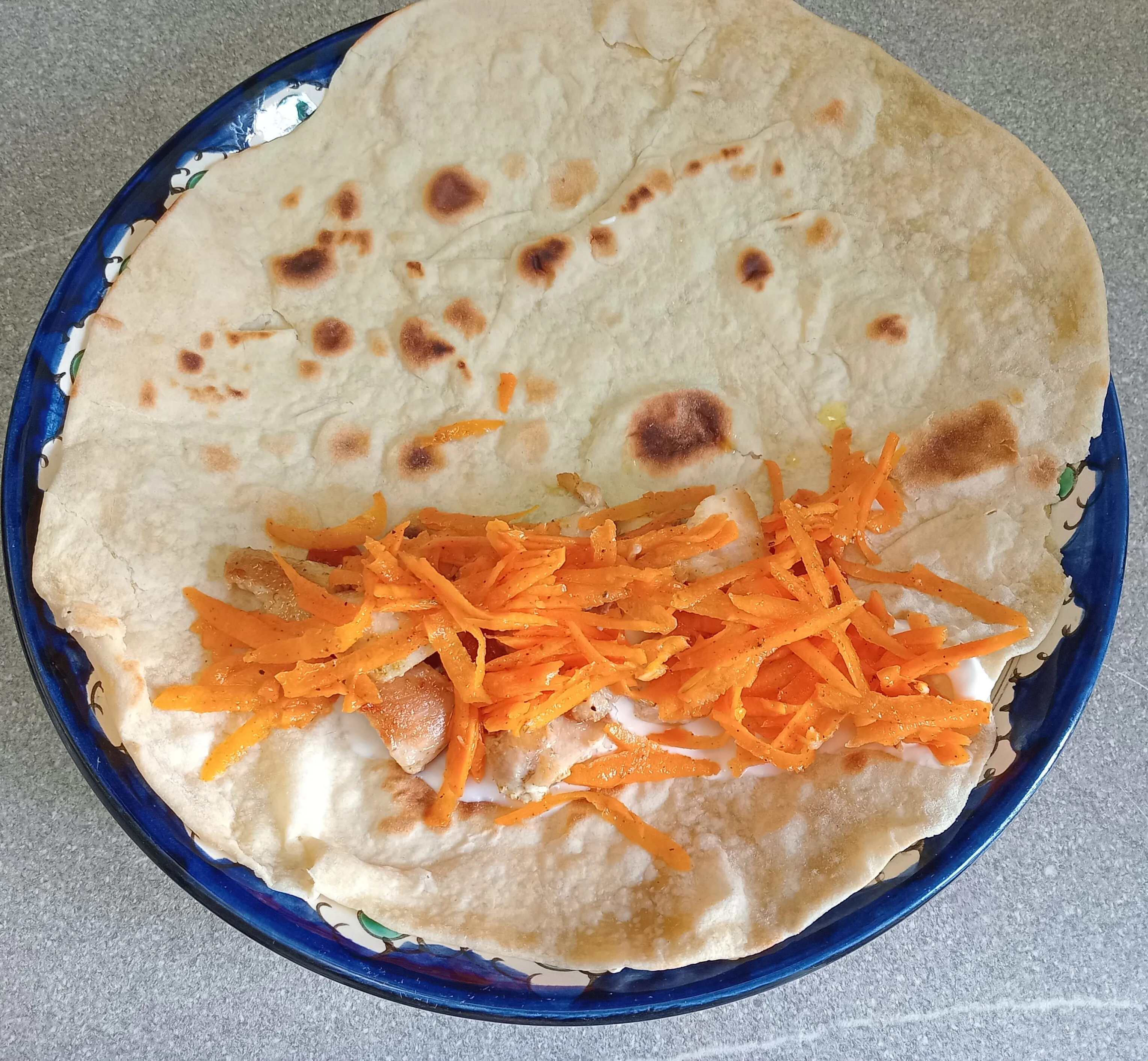 Выложите на лаваш обжаренное куриное филе и морковь по-корейски.