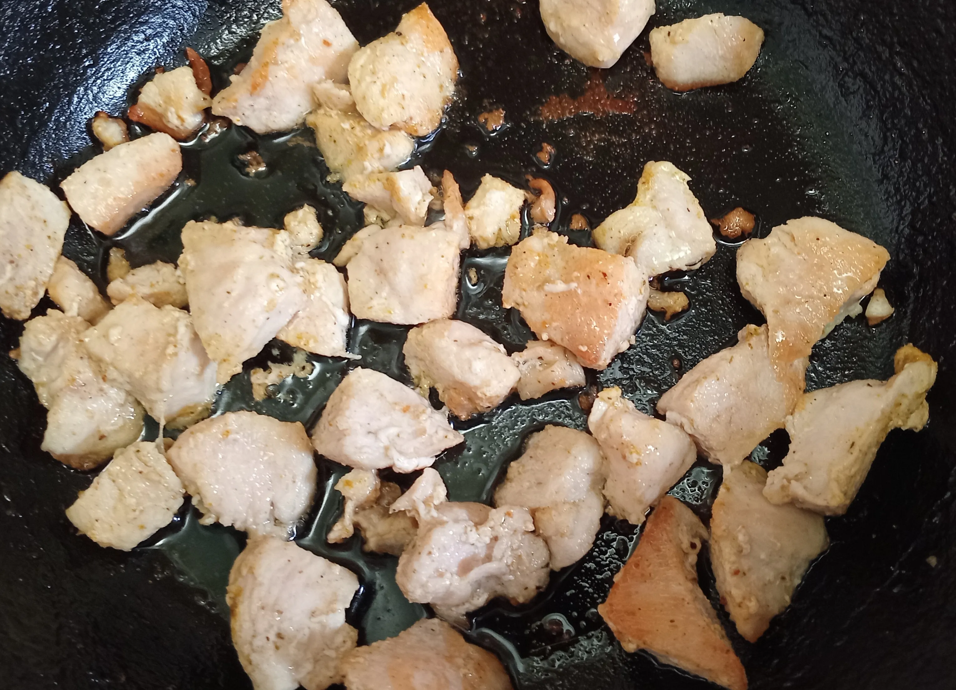 Куриное филе нарежьте кубиками и обжарьте 10 минут на растительном масле, посолите.
