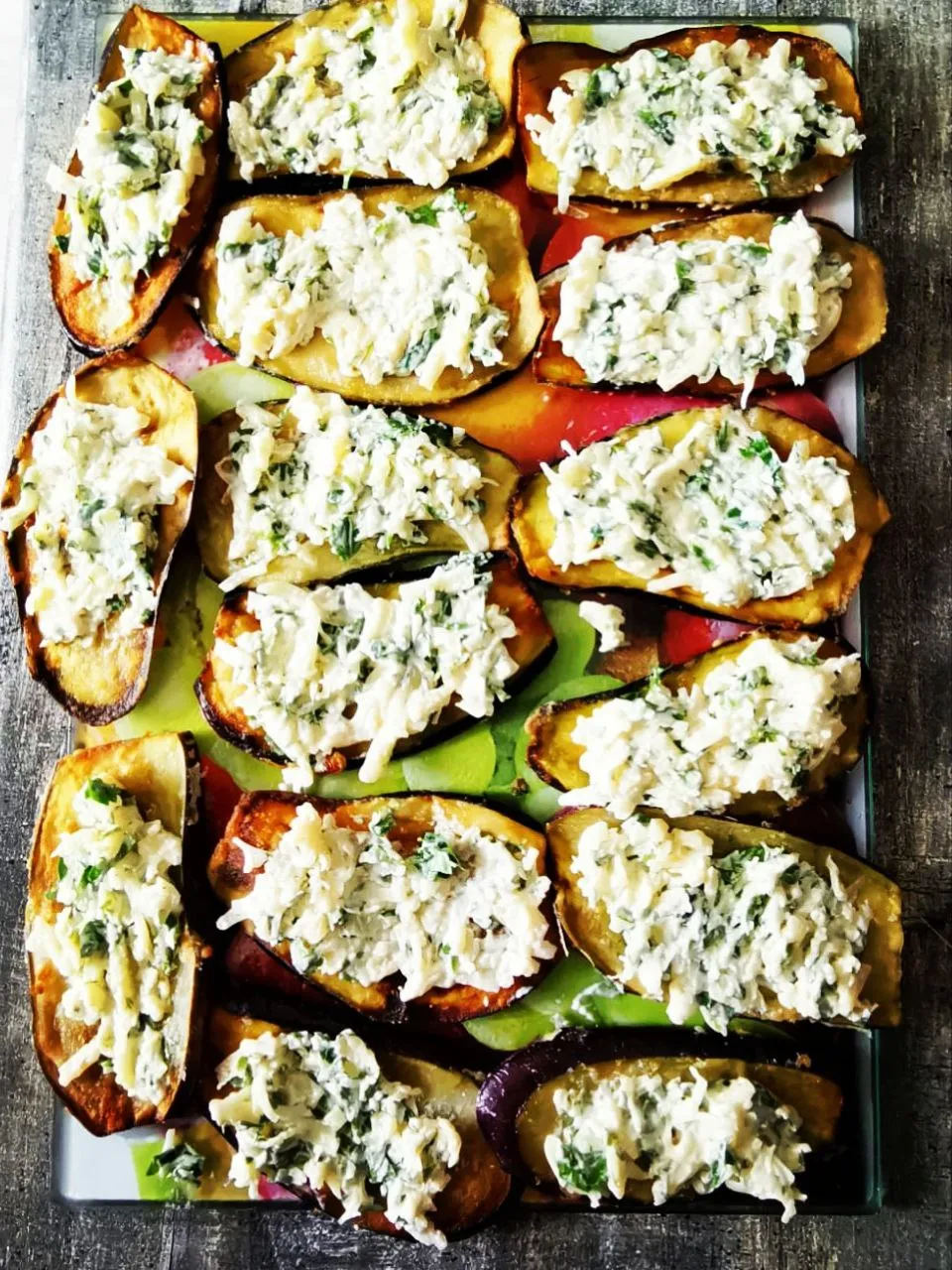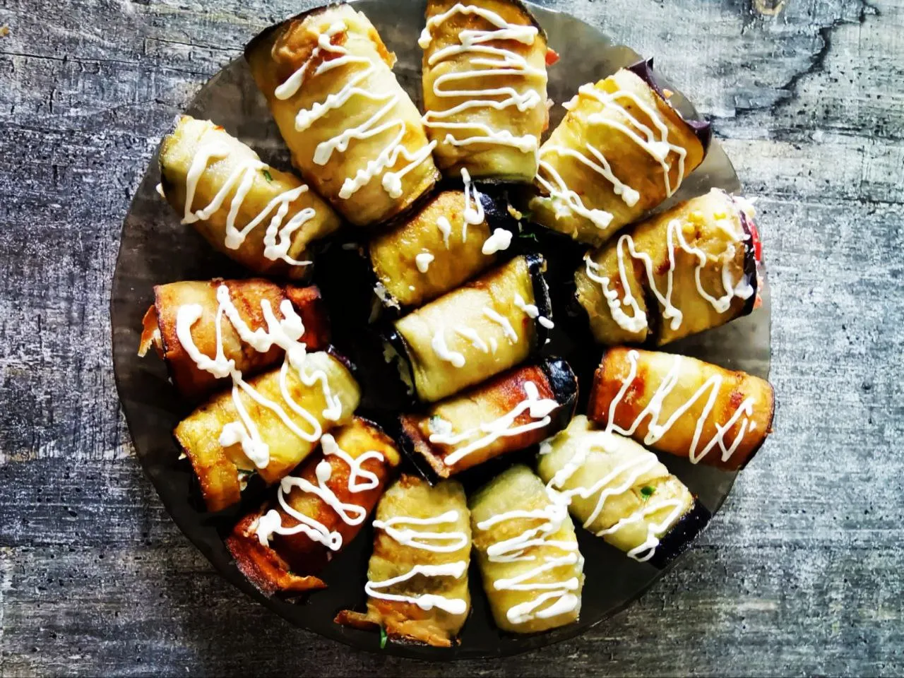 Баклажаны обмакните в муку, обжарьте, лишнее масло уберите бумажным полотенцем Тонким слоем выложите начинку.