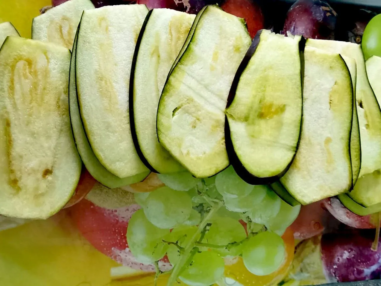 Баклажаны помойте, нарежьте тонко, слегка посолите, подождите пока дадут сок, осушите бумажным полотенцем.